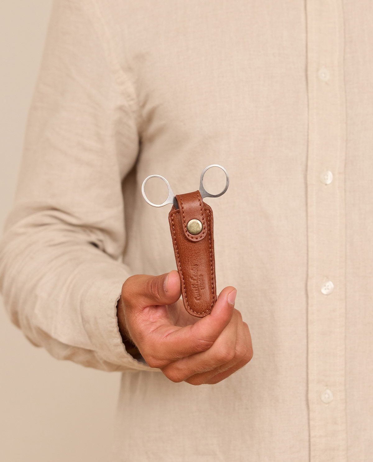 "Camillo" er et stilfullt sakseetui som er spesialdesignet for sikker oppbevaring av negleklippere og andre små sakser. Laget av edelt brunt skinn, beskytter det saksene dine mot riper og slitasje og gir en stilfull og varig oppbevaring. Enten det er for daglig bruk eller på reise – med "Camillo" har du alltid saksene dine trygt oppbevart og lett tilgjengelig.