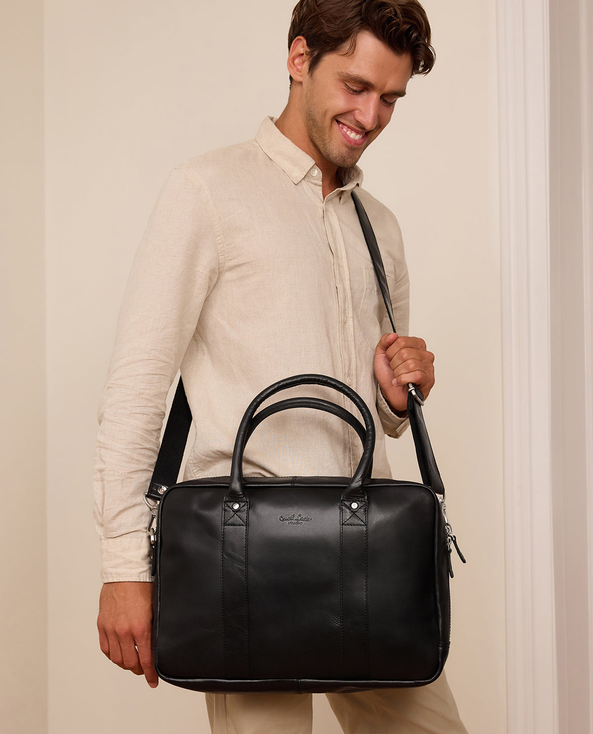 Vi presenterer: "Fynn" - din nye lærfavoritt. Enten det er til universitetet, jobb eller som en hverdagsveske: "Fynn" overbeviser i enhver situasjon, for den har alt du kan forvente av en dokumentmappe: I tillegg til et rom for din 15" laptop har Fynn mange andre rom hvor du kan oppbevare notatblokker, rapporter og bøker, samt diverse ladere, notatbok og lignende, ditt penneetui, essensielle ting som lommebok, smarttelefon, men også vannflaske og nøkler - rett og slett alt du bør ha med deg på en forretningsreise. Takket være de brede glidelåsene får du raskt og enkelt tilgang til alt du trenger. Og hvis du noen gang ønsker å bære vesken over skulderen, er ikke det noe problem, for "Fynn" har ved siden av de to håndtakene en avtakbar skulderrem som du kan justere til den lengden som passer deg. I tillegg reiser du komfortabelt med vår lærveske, da den har en praktisk trillebåndsløkke, slik at du enkelt kan feste den til din rullekoffert.