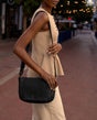 Den lille håndvesken «Aliya» er en svart lærveske for damer som umiddelbart fanger oppmerksomheten med sin flettede overflate. Det vasket Storfelær føles behagelig mykt og gir vesken et avslappet, eksklusivt utseende. «Aliya» er funksjonell i hverdagen: Et skjult AirTag-rom gir ekstra sikkerhet, mens den justerbare skulderremmen gir fleksible bæremuligheter. Kombinasjonen av magnetlås foran og glidelås i hovedrommet kombinerer komfort med en trygg følelse når du er på farten.