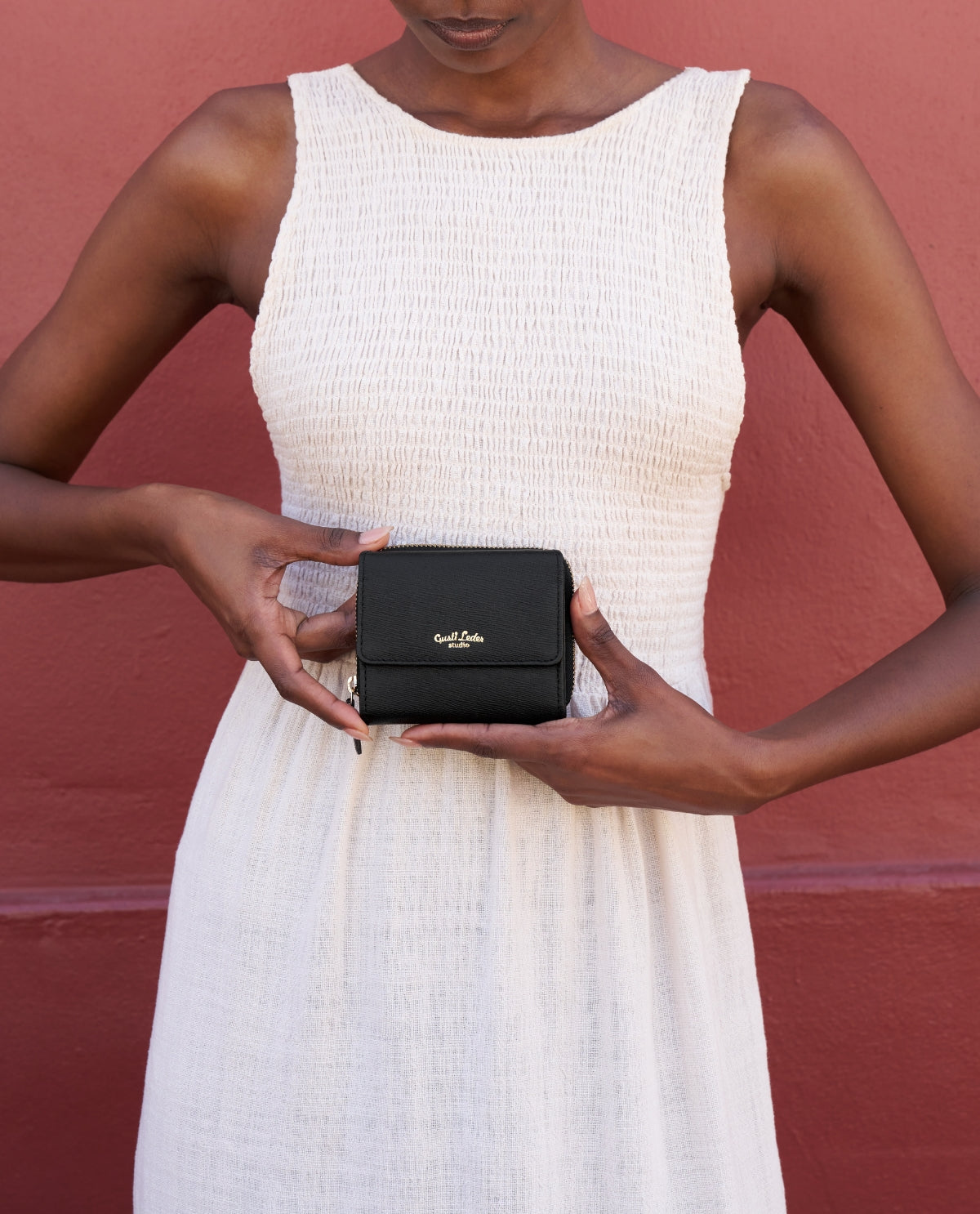 Innvendig har «Brigitta» et seddelrom, et utfoldbart vindu, plass til opptil 6 kort og et separat myntrom som lukkes med glidelås. Slik ruller det ikke uhindret rundt i vesken. Lommeboken er laget av høykvalitets oksehud i Saffiano-design og lukkes med en trykknapp. Nede i lommen, så er du klar – med lommeboken «Brigitta»!