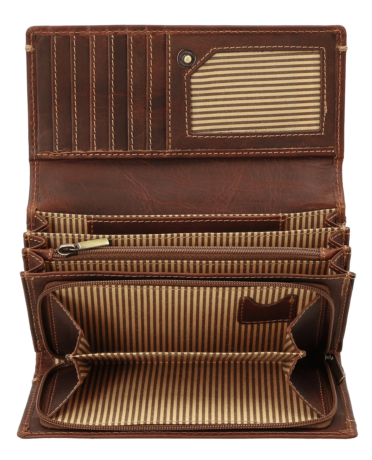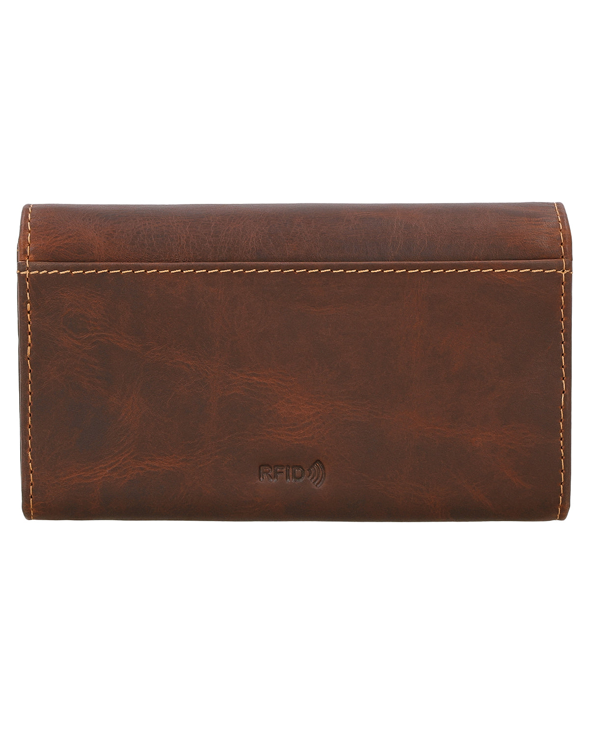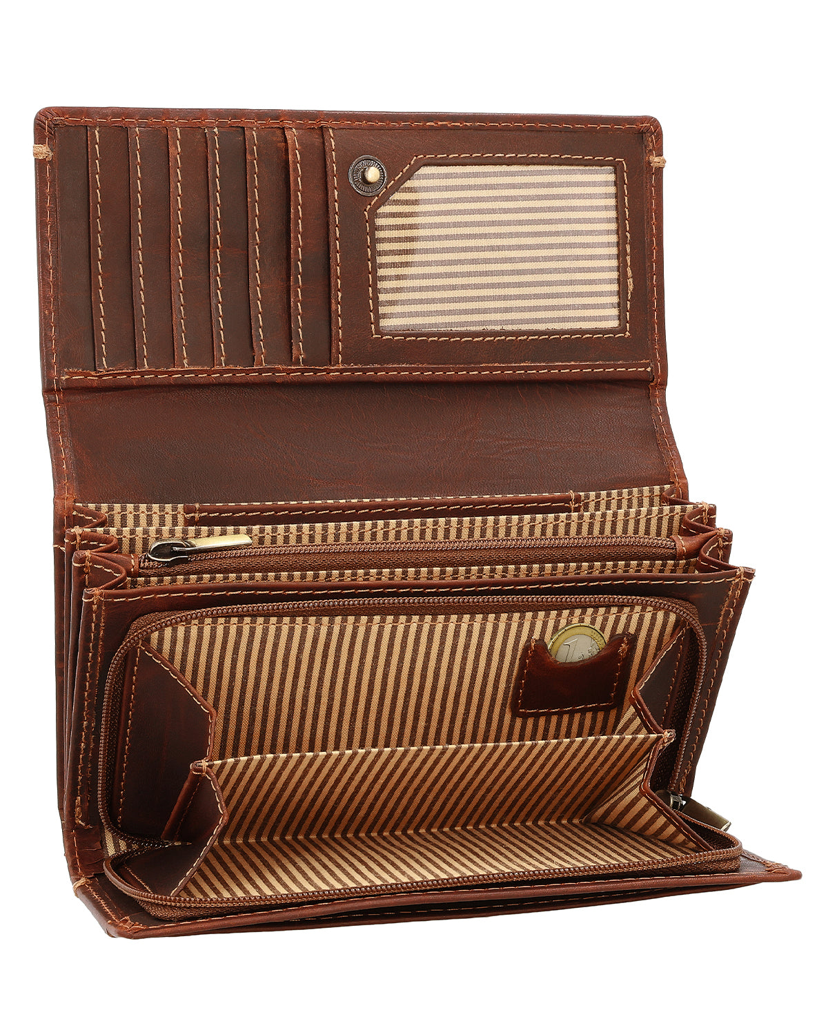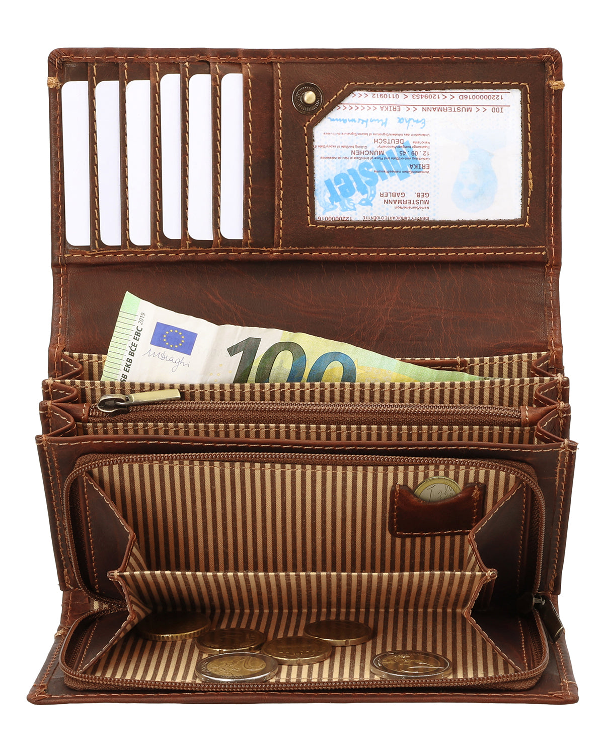 Oppdag vår høykvalitets dame-lommebok "Angelique" i brunt skinn – en elegant følgesvenn som perfekt forener design og funksjonalitet. Inspirert av den urbane Berlin-flairen er den ideell for din hverdag, enten det er på bytur, i kafeen eller på reise. Det ekte, slitesterke skinnet gir et edelt utseende og en behagelig følelse, som bare blir vakrere med tiden. "Angelique" står for stil, kvalitet og organisasjon – alt du forventer av en moderne lommebok.