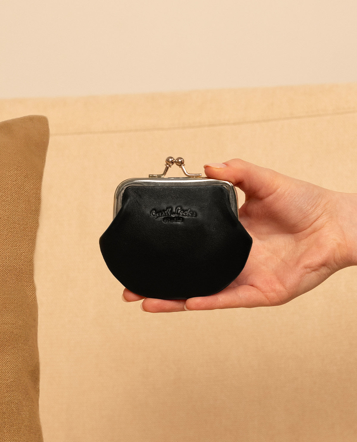Inni kan du enkelt oppbevare mynter, og en eller annen seddel finner sikkert også sin plass. Det høykvalitets garvede kuskinnet viser seg som et robust materiale som tåler hverdagsbelastninger, samtidig som det er mykt og behagelig. Klemme-låsen holder pengene dine trygt på plass. Særlig elegant er Gusti Leather pregingen på forsiden og det søte stripete stoffet inni. Med "Fenja" har du de viktigste tingene med deg, men ikke et gram for mye.