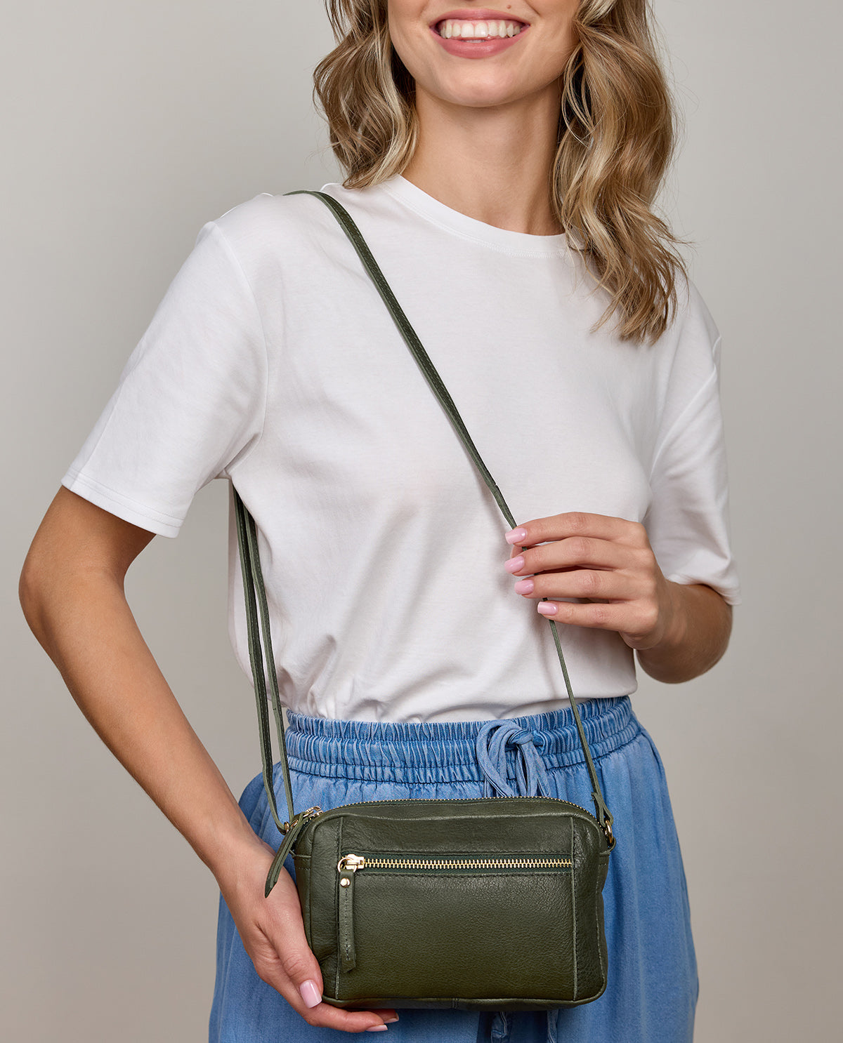 Med sitt rette, kompakte design komplementerer og beriker "Dominic" enhver av dine antrekk uten å presse seg i forgrunnen. Det store hovedrommet tilbyr nok plass til lommebok, smarttelefon og nøkler. På forsiden er det et mindre rom for alt du raskt trenger å ha for hånden. Begge rommene er sikret med robuste glidelåser mot tyveri. Uansett om du bare skal handle noen småting raskt eller gjøre natten til dag på en lengre klubbkveld: "Dominic" følger deg gjerne og tiltrekker samtidig noen beundrende blikk.