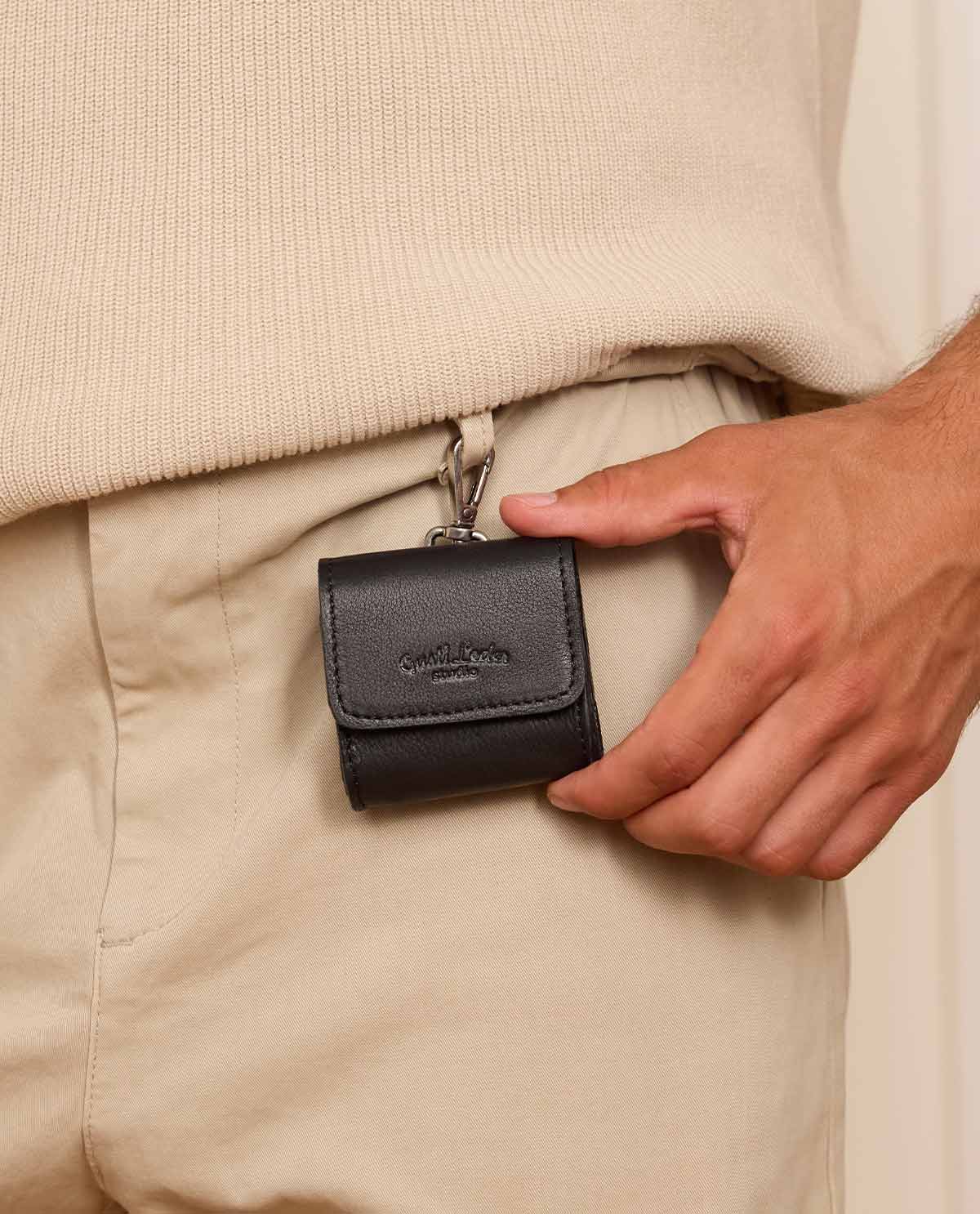 "Andrico" beskyttelsesetui for dine AirPods og lignende hodetelefoner kombinerer praktisk beskyttelse med stilig design. Laget av høykvalitets ekte svart lær, beskytter det ikke bare hodetelefonene dine mot riper og støt, men gir dem også et elegant og tidløst utseende. Enten du er på farten eller vil oppbevare hodetelefonene dine trygt – "Andrico" etuiet er den perfekte følgesvennen for enhver anledning.