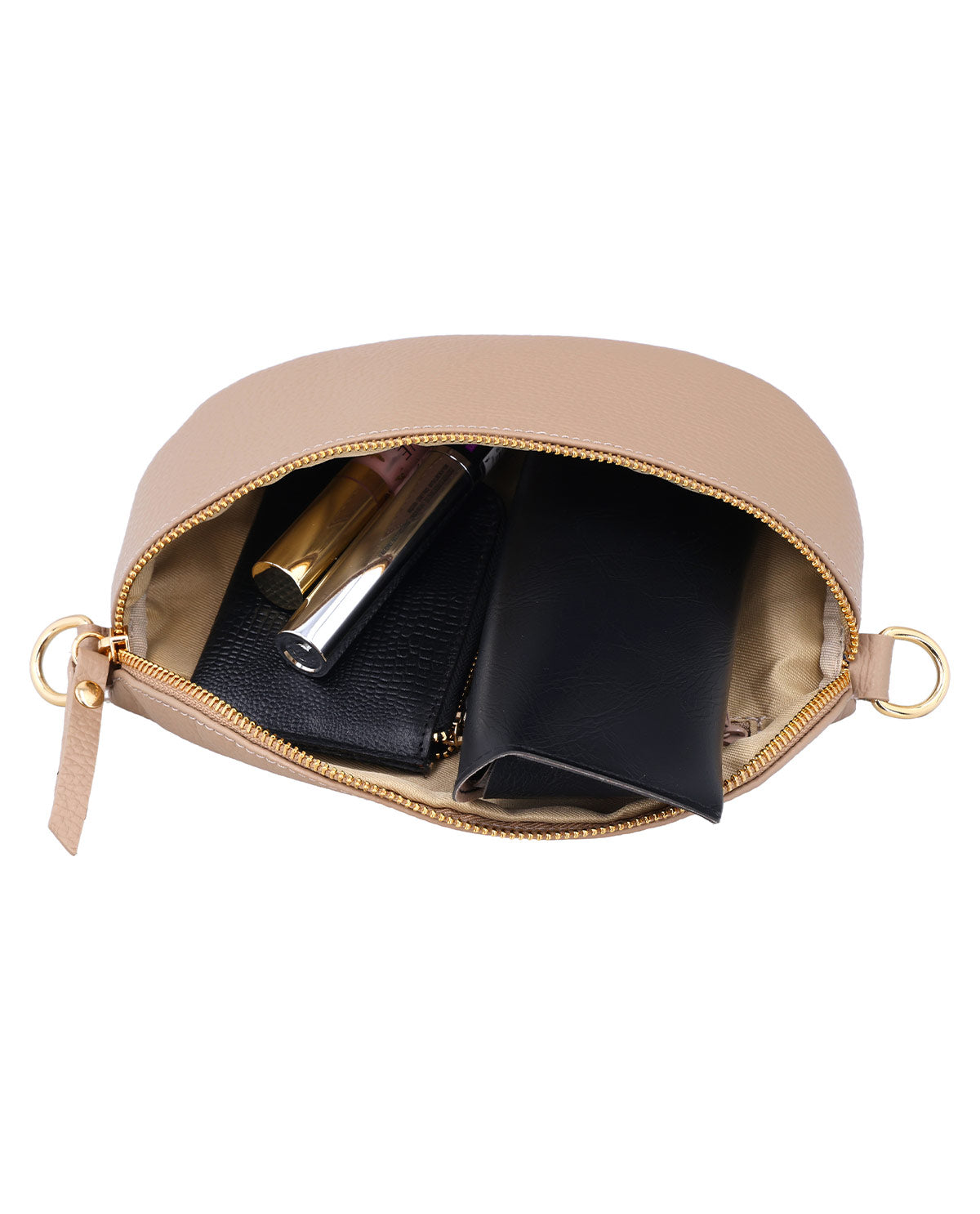 Die "Brinja" Umhängetasche besticht durch ihr elegantes Design und ihre hohe Funktionalität. Mit der markanten, halbrunden Silhouette und dem vollständigen Reißverschluss entlang des oberen Randes bietet sie nicht nur ausreichend Platz für Deine Essentials, sondern auch Sicherheit für all Deine persönlichen Gegenstände. Das hochwertige Leder verleiht ihr eine edle Optik, die sich perfekt in Deinen modernen Alltag einfügt. Im Inneren findest Du zudem das fein eingeprägte "Made in Italy"-Logo, das die Herkunft und Qualität dieser Tasche eindrucksvoll unterstreicht.