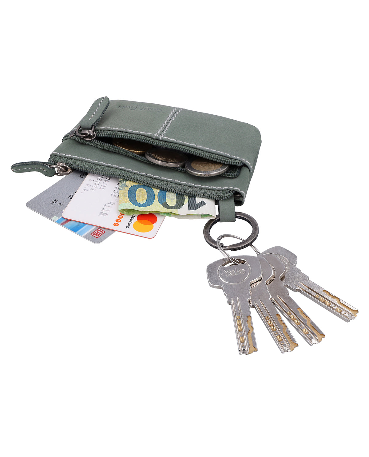 Das Schlüsseletui im praktischen Hosentaschenformat ist nämlich mit zwei separaten Fächern ausgestattet, die beide mit einem Reißverschluss schließen. Das größere Fach wartet - wie es sich für ein Schlüsseletui gehört - mit einem inneliegenden Schlüsselring für Deine Schlüssel auf, ist aber auch groß genug, um Geldscheine oder sogar ec-Karten sicher darin verstaut zu wissen. Das aufgesetzte kleinere Fach eignet sich derweil hervorragend für etwas Münzgeld oder einen Einkaufs-Chip.