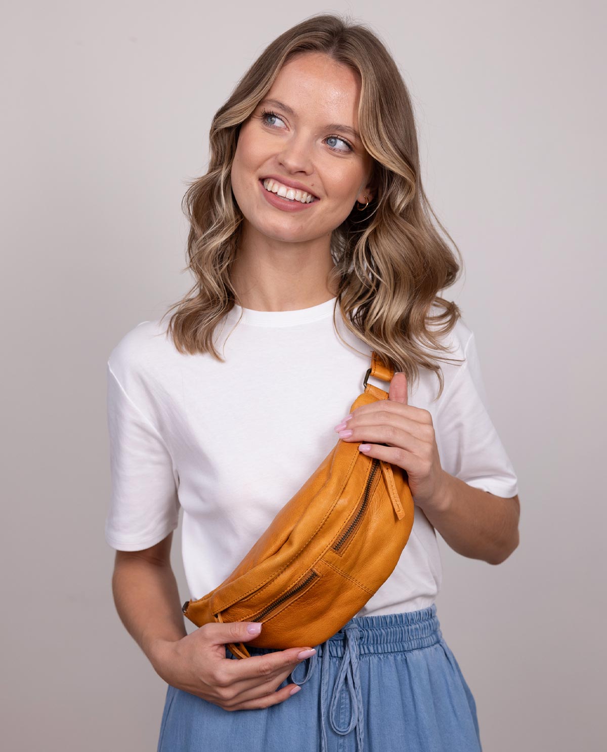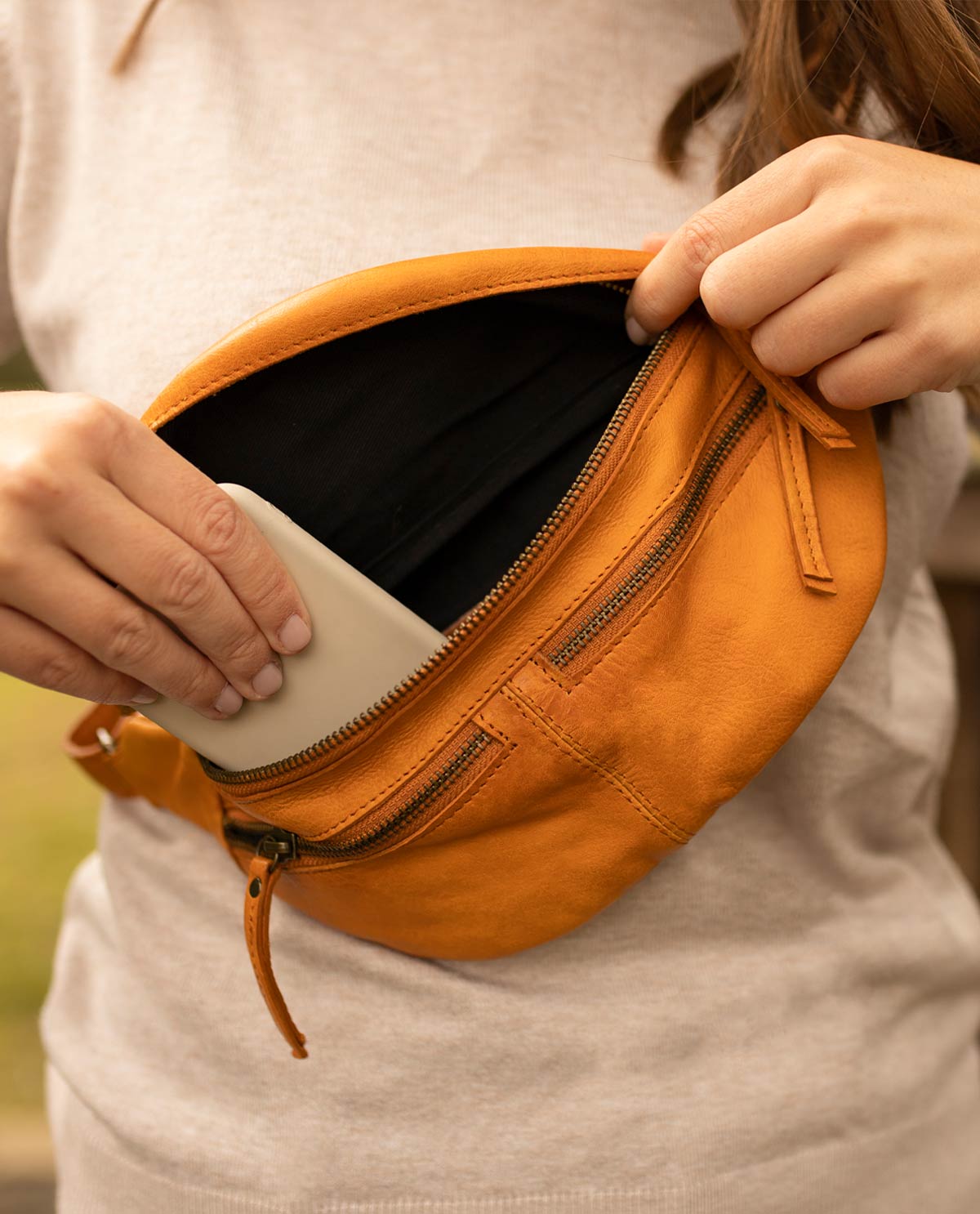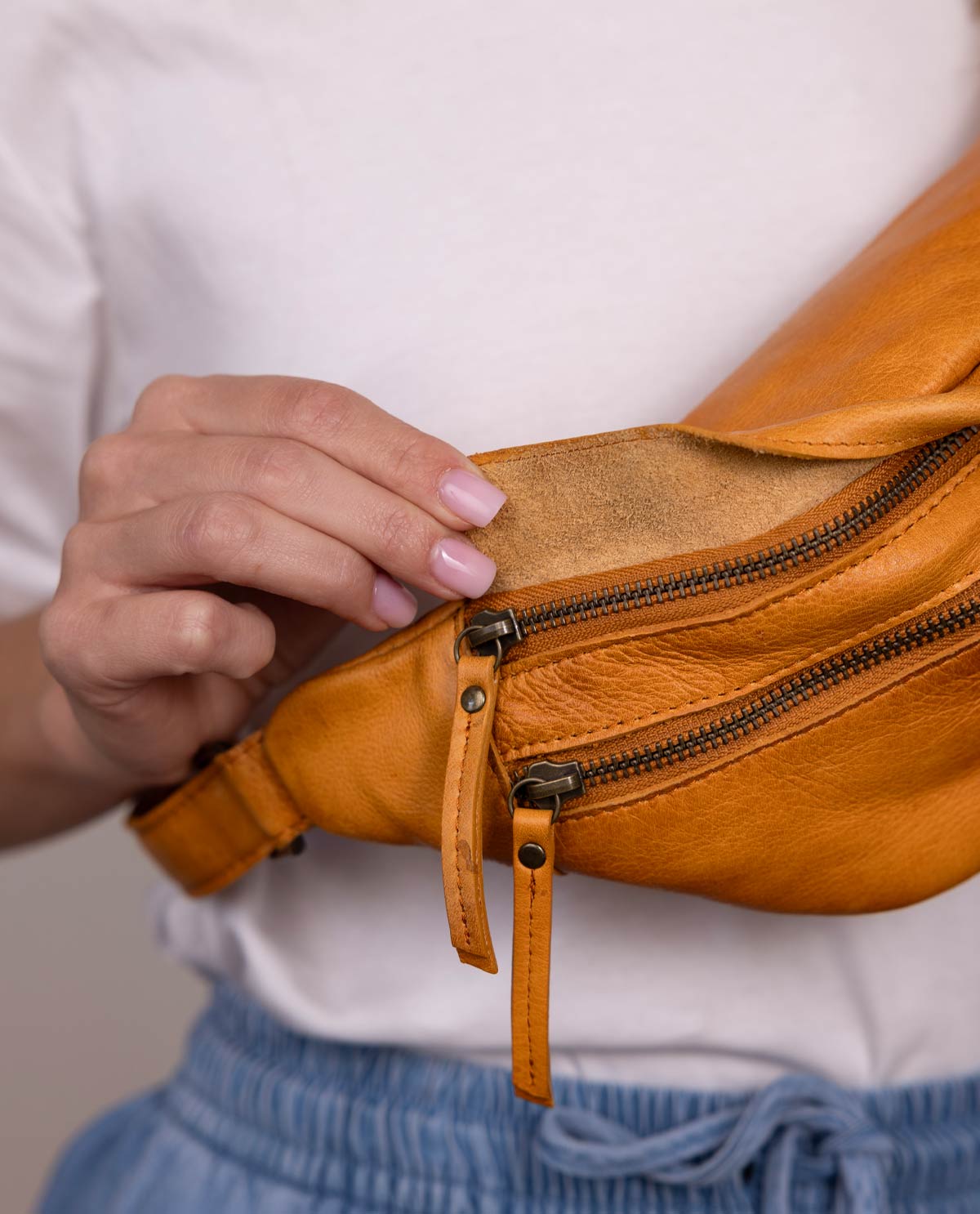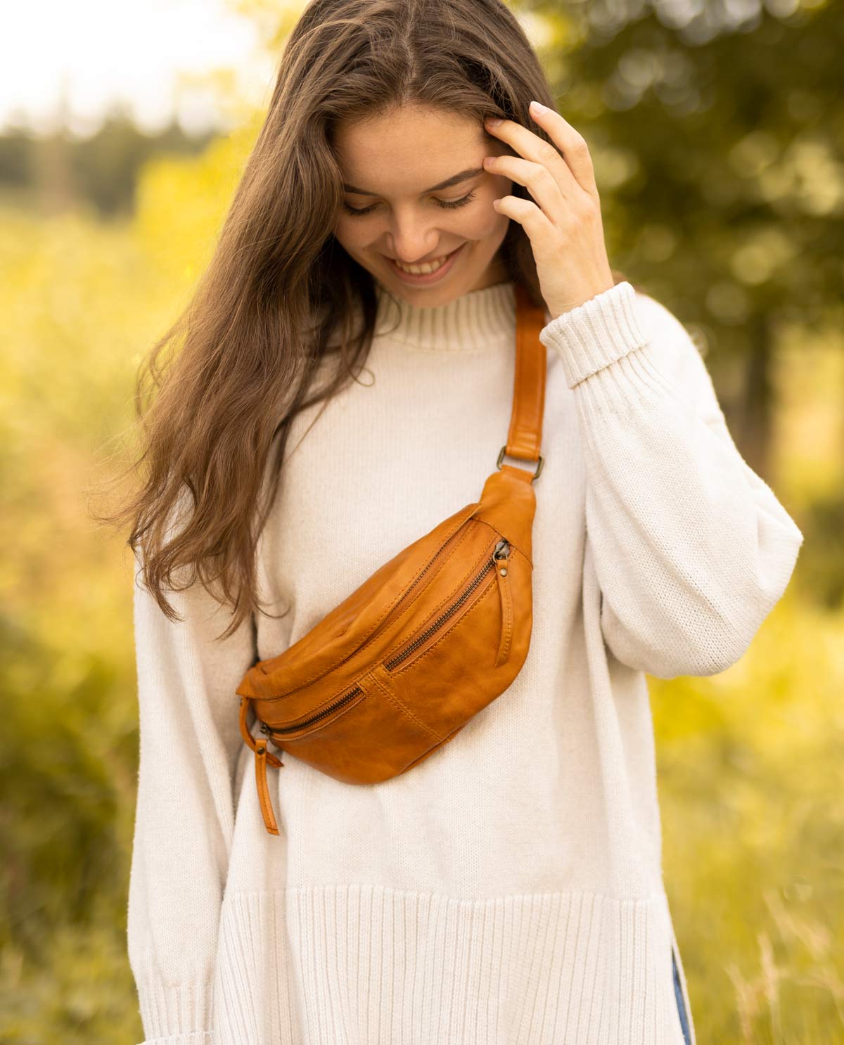 Du suchst noch eine coole Bauchtasche für die nächste Festivalsaison, eine praktische Aufbewahrungsmöglichkeit für Snacks auf der Piste oder einfach eine kleine Tasche, in der du deine Sachen beisammen halten kannst? Dann bist du bei "Acton" auf jeden Fall richtig! Die coole Vintageoptik macht die Tasche aus robustem Rindsleder definitiv zu etwas besonderem, so siehst du immer gut gestylt aus. Im großen Hauptfach kannst du deine Habseligkeiten großzügig unterbringen. An der Vorderseite findest du noch zusätzlich zwei kleine Taschen, die du ebenfalls mit einem Reißverschluss verschließen kannst. Das Coachella kann kommen! Aber auch im Winter macht er auf Konzerten eine gute Figur und nimmt mühelos Portemonnaie, Schlüssel und Smartphone für dich mit! So kannst du ganz gedankenlos tanzen und die Musik genießen, deine Sachen sind sicher.