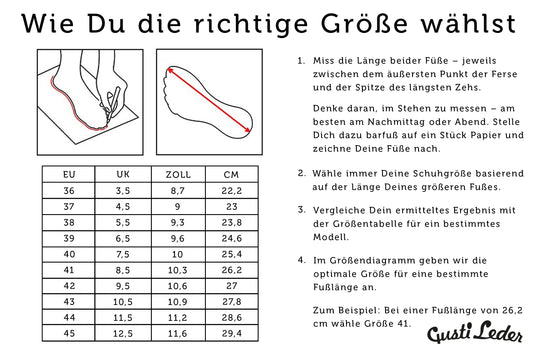 Unsere Schuhe entsprechen den EU-Größen und fallen in der Regel größengetreu aus.