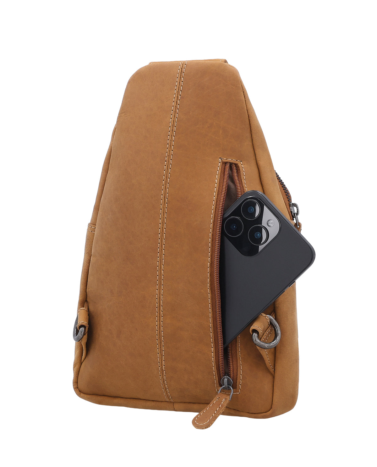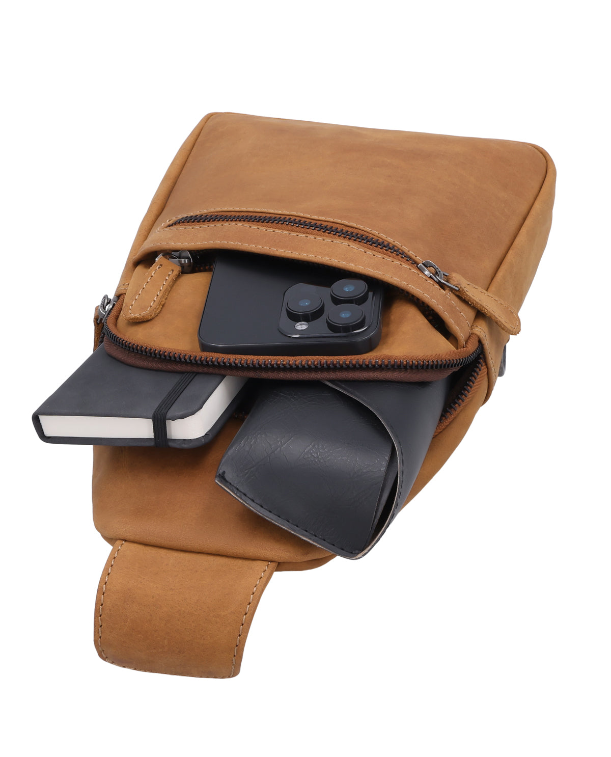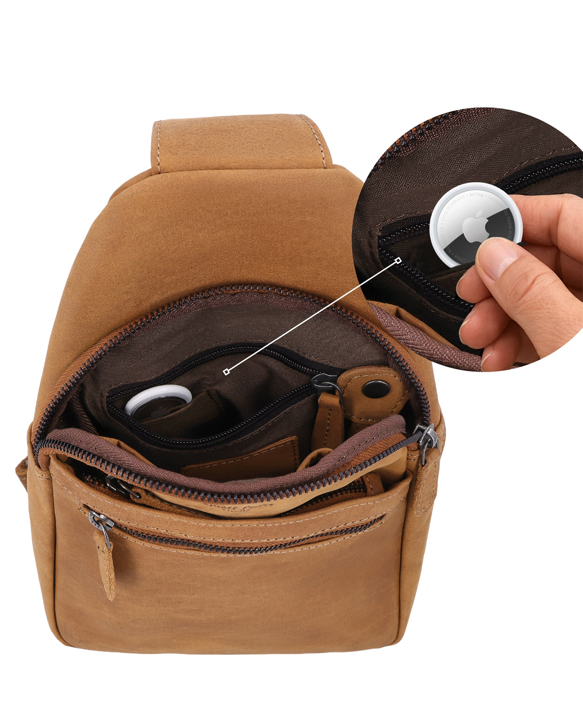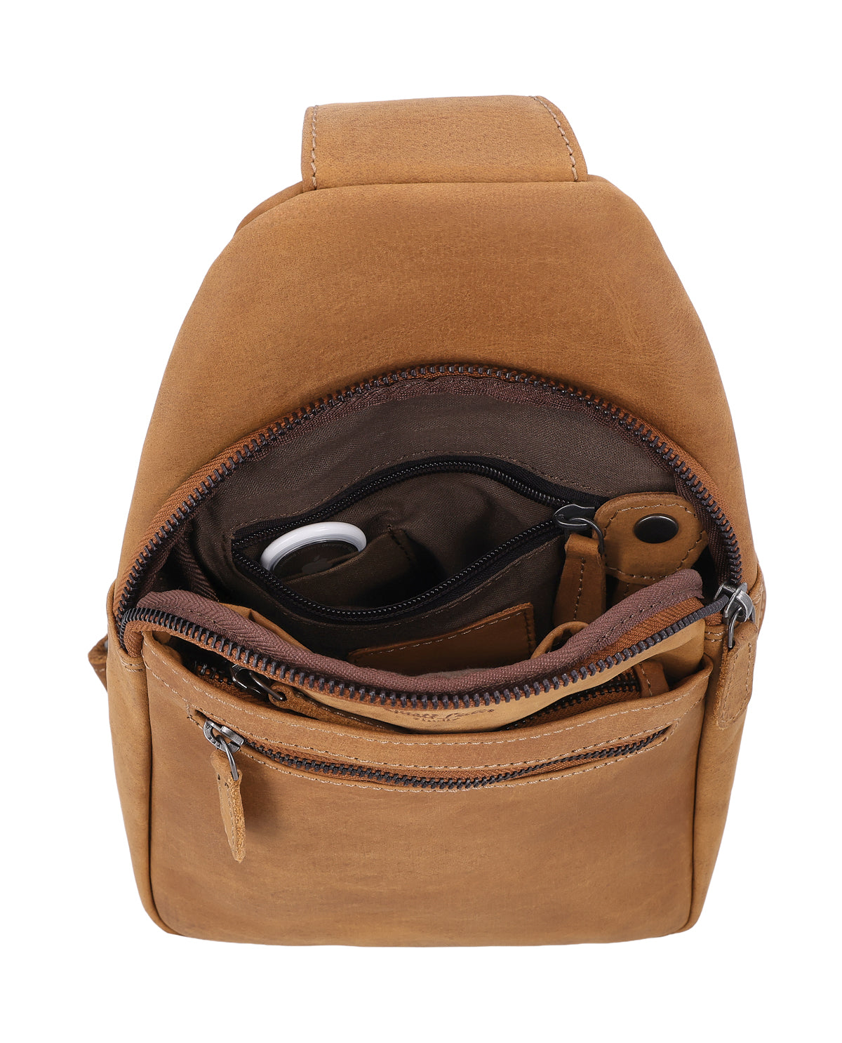 Die Ledertasche „Azon“ ist ein vielseitiger Slingpack für Herren, der sich Deinem Alltag mühelos anpasst. Ein abnehmbarer Schlüsselanhänger hält Deine Schlüssel zuverlässig an Ort und Stelle, und ein verstecktes AirTag-Fach gibt Dir unterwegs ein extra gutes Gefühl. Außen sorgen zwei Reißverschlussfächer – eins vorne und eins hinten – dafür, dass Du Wichtiges schnell und sicher verstauen kannst. Dazu kommt ein weiteres Reißverschluss-Außenfach für Dinge, die Du gern separat griffbereit hältst. Ob als Gürteltasche, quer über der Schulter oder als kompakter Schulterrucksack getragen – „Azon“ bleibt flexibel und bequem, egal wie Du unterwegs bist. Das braune Leder verleiht der Tasche eine natürliche, urbane Ausstrahlung und macht sie zu einem zuverlässigen Begleiter für Stadt, Reisen oder spontane Unternehmungen.