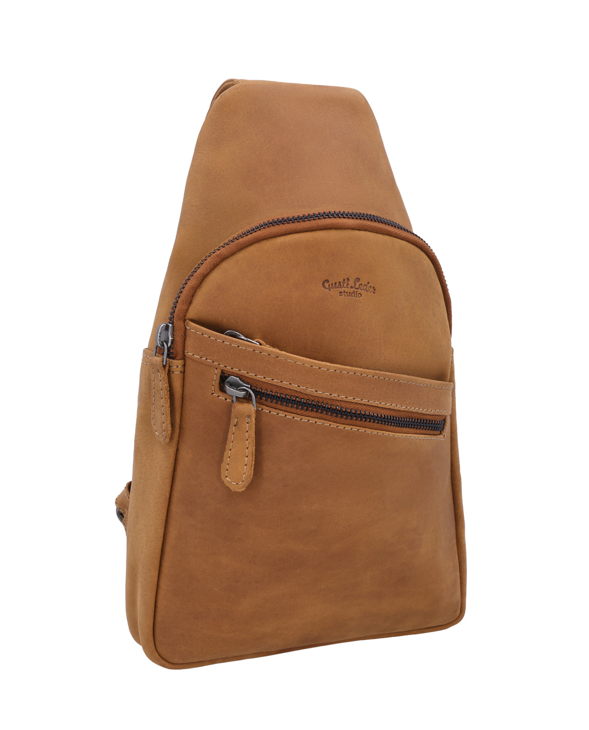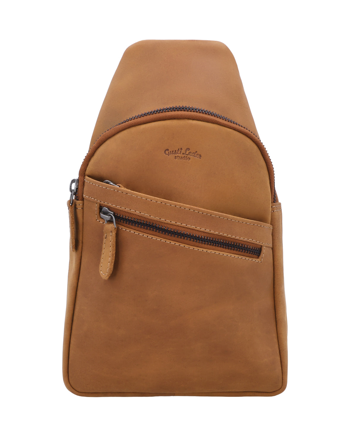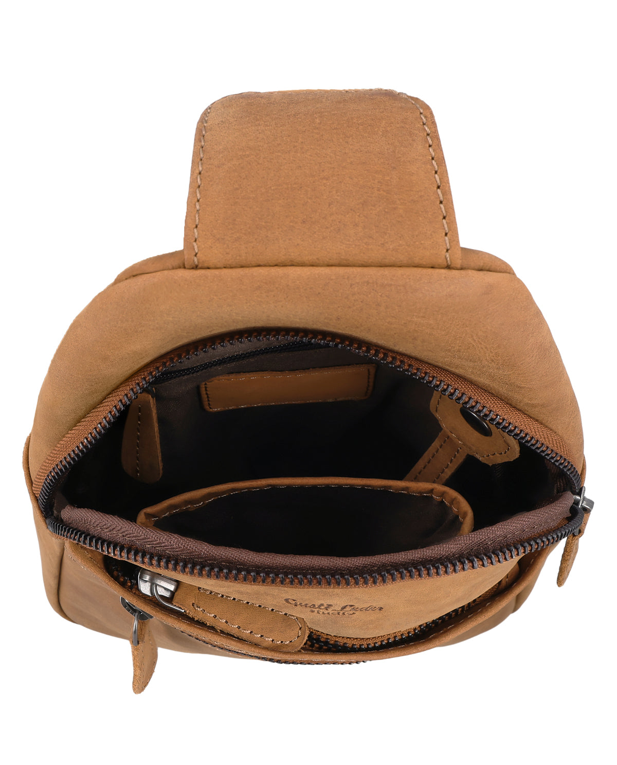 Im Inneren hilft ein Innen-Steckfach dabei, Kleinigkeiten übersichtlich zu sortieren, während ein Reißverschluss-Innenfach Wertsachen zuverlässig schützt. Der längenverstellbare und abnehmbare Trageriemen ermöglicht Dir verschiedene Trageoptionen und passt sich Dir flexibel an. Verschlossen wird „Azon“ über einen Reißverschluss am Hauptfach, damit unterwegs alles sicher an seinem Platz bleibt. Für eine persönliche Note ist außerdem ein Gravur-Patch integriert, und das dezente Gusti-Logo rundet den Look stimmig ab. „Azon“ ist eine Leder-Slingbag, die Funktionalität und Alltagstauglichkeit gekonnt vereint.