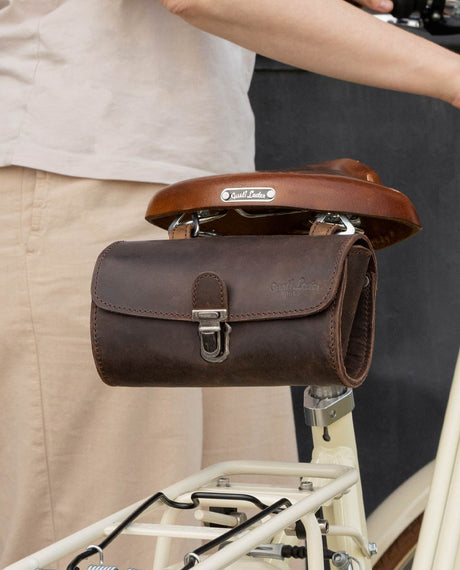 Jede Seite verfügt über ein geräumiges Hauptfach, in dem Werkzeug, Schloss & Schlüssel sicher verstaut werden können. Der Dornschnallenverschluss sorgt dafür, dass nichts herausfallen kann, selbst auf unebenen Strecken. Dank der breiten Lederlasche, die auf der Querstange aufliegt, bleibt die Tasche stabil an ihrem Platz. Zusätzlich sorgt ein Klettverschluss auf der Rückseite dafür, dass beide Taschen miteinander verbunden bleiben und nicht verrutschen. Das hochwertige Büffelleder verleiht der Tasche Form und Stabilität und macht sie zu einem stilvollen Hingucker an Deinem Fahrrad.