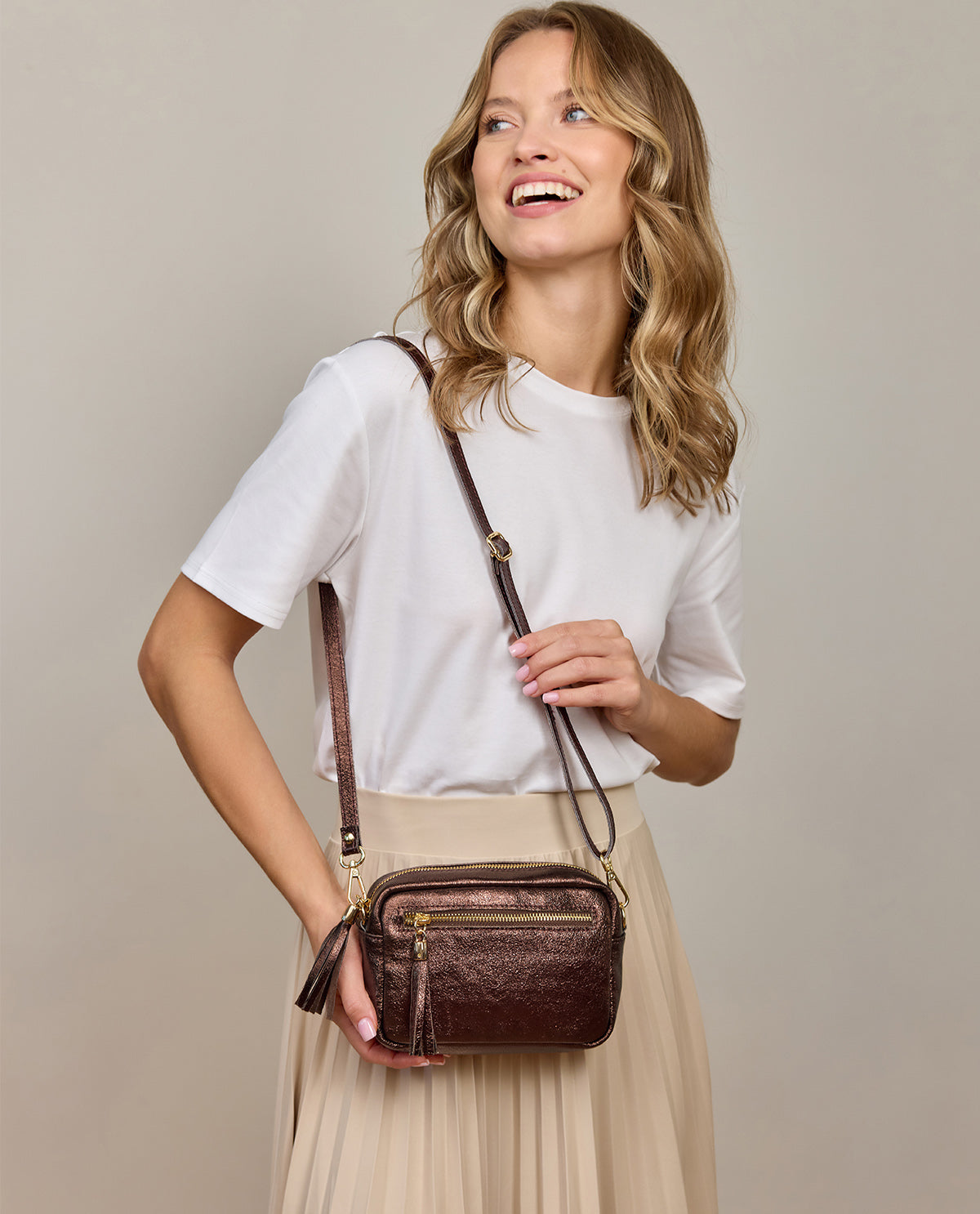 Die "Cariba" Umhängetasche aus hochwertigem Leder ist der ideale Begleiter für jede Frau, die sowohl Stil als auch praktischen Nutzen schätzt. Mit ihrem sicheren Reißverschlussverschluss kannst Du Deine Wertsachen sicher aufbewahren, während der elegante Anhänger am Reißverschluss der Tasche einen besonderen Akzent verleiht. Ihre schlichte, aber auffällige Optik macht sie zum perfekten Accessoire für den Alltag und besondere Anlässe. "Cariba" vereint edles Design mit durchdachter Funktionalität – ein Must-have für jedes Outfit.