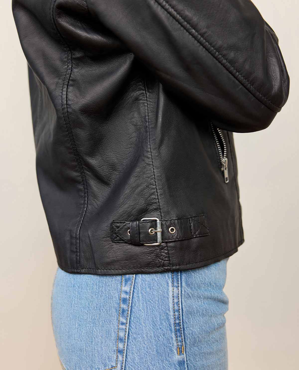 A classic with a modern twist – the "Ova" biker jacket made of black genuine leather adds a striking, stylish touch to your outfit. Whether you pair it with jeans and boots or layer it over a dress, this leather jacket makes a fashion statement. The high-quality leather feels pleasantly soft and develops a unique patina over time – just as unique as you are.