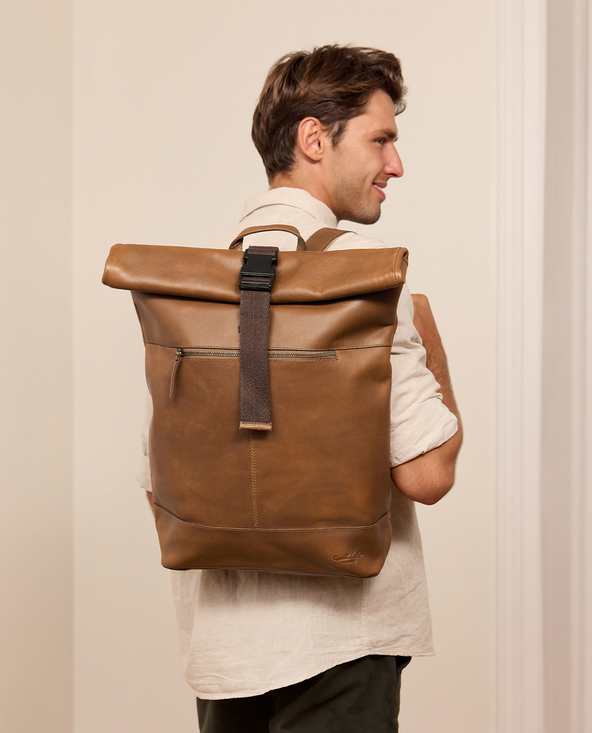 This bag won’t just win you over with its stylish looks, you’ll love how much space there is inside too. You can easily fit your A4 folders, 15-inch notebook, books, and a big water bottle inside his spacious inner compartments. The closure on the main compartment is as simple as it is practical, it protects your belongings from moisture and dust. The interior is lined with brown canvas, which is also used for the padded back section and the underside of the adjustable shoulder straps - maximising your comfort. The external zipped pocket has plenty of space for the things you need to grab quickly: tissues, chewing gum, sanitiser, etc.