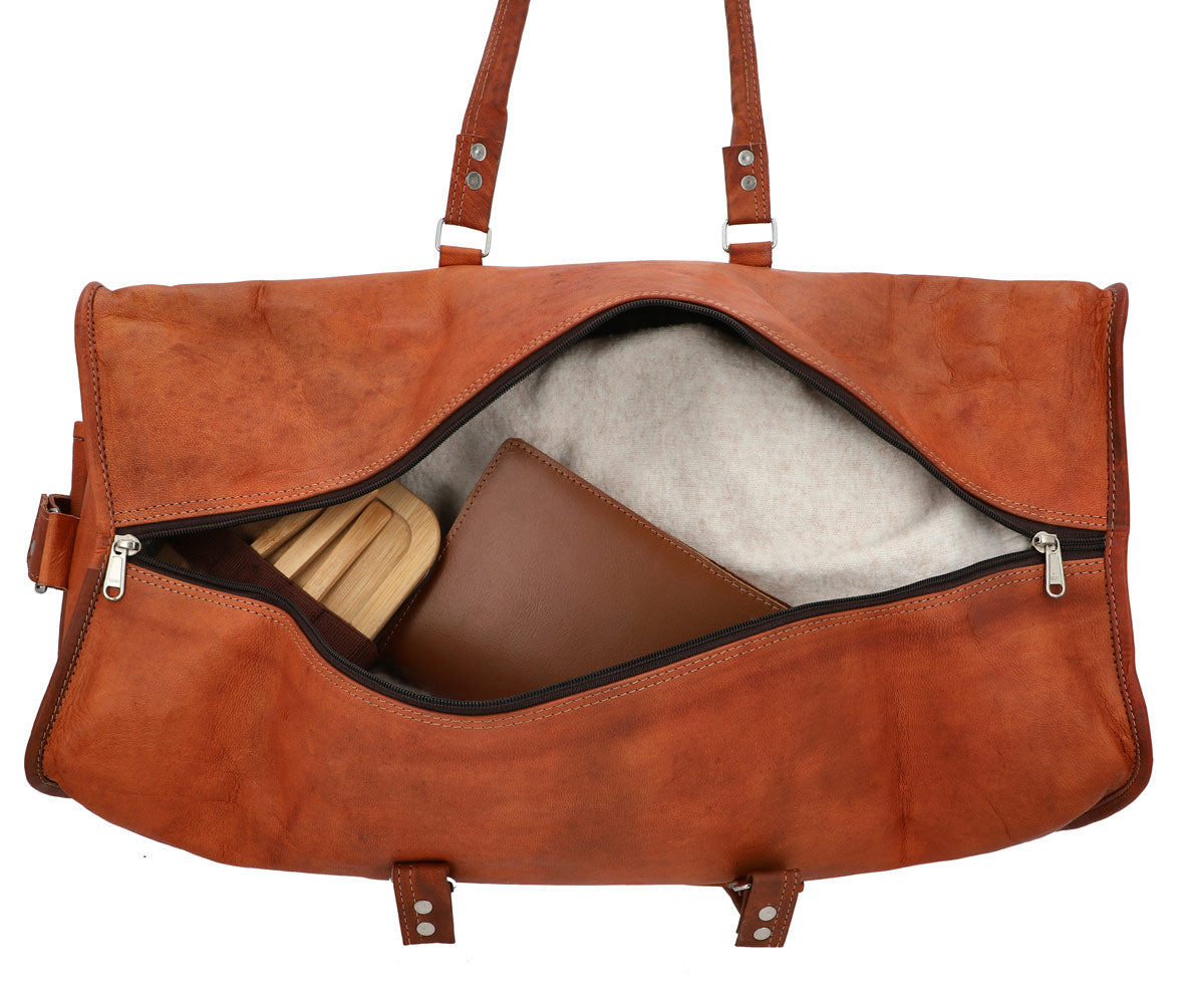 This vegetable-tanned goatskin leather cabin bag will impress you with its striking classic compact design, comfortable straps, and spacious compartments. There's plenty of space for your clothes and two pairs of shoes in the main compartment, as well as your toiletry bag and current read—there's even space for a notebook or folder. Keep your valuables safe in the additional zipped internal pocket. There's an extra external pocket on the front of the bag that you can use to store your keys, tissues, emergency medication and much more. Secure your belongings in “Oscar” using the charming vintage buckle. Your things are kept safe in the bag's main compartment by a zip.