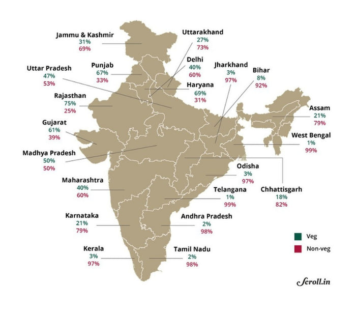• In this overview, you can see the percentage distribution of vegetarians (green) and non-vegetarians (red) in India. Especially in the north, east, and south of the country, the proportion of people who eat meat is significantly higher.
