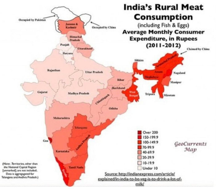 • This graphic on the distribution of meat consumption in India illustrates that meat consumption in India is more widespread than previously assumed. The stronger the red, the higher the meat consumption!
