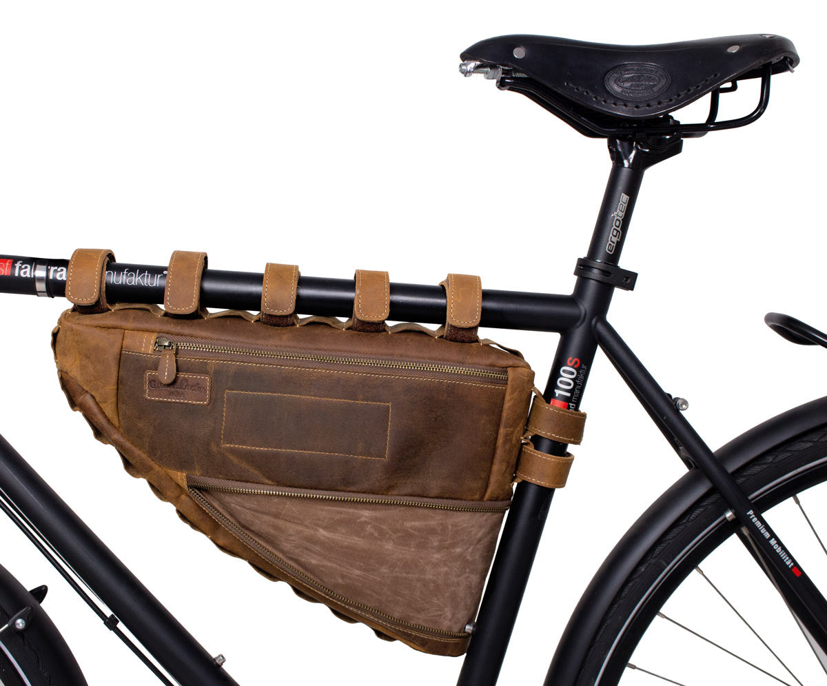 Our frame bag “Lance A.” has it all. No matter if you’re cycling to work or heading out for your next adventure, all of your belongings, no matter how big or small, will be safe in this bag. Thanks to the high-quality processed sturdy leather, and his ease of use, “Lance A.” is truly unique. This frame bag has what it takes to accompany you on any adventure.
