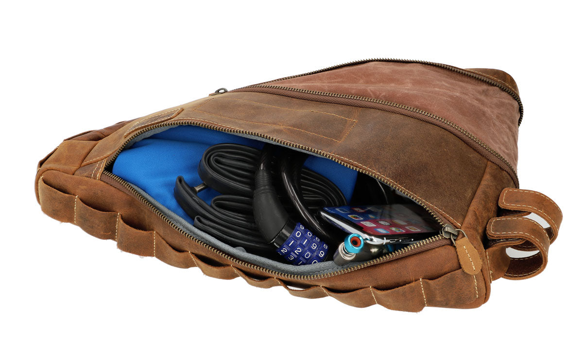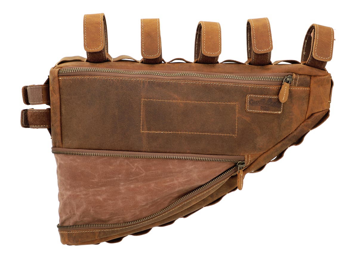Our “Lance A.” won’t just impress you with his beautiful leather look, but with the multitude of ways he can be attached to your bike using his zips and loops. Need a bit more space? No worries! “Lance A.” has a spacious main compartment that can be expanded using his zips. The spacious main compartment offers you plenty of space for your cycling essentials, as well as your rain jacket, repair kit, and more! You can even fit a book in this spacious frame bag! His extra zipped external pocket provides you with space to store things you need to access quickly, like your sanitiser, gum, and more. “Lance A.” has a water-resistant polycotton lining that can be easily wiped down, so your belongings are protected against moisture or left-over oil on your tools. This frame bag has sturdy Velcro closures which ensure nothing will get lost when you’re on the go.