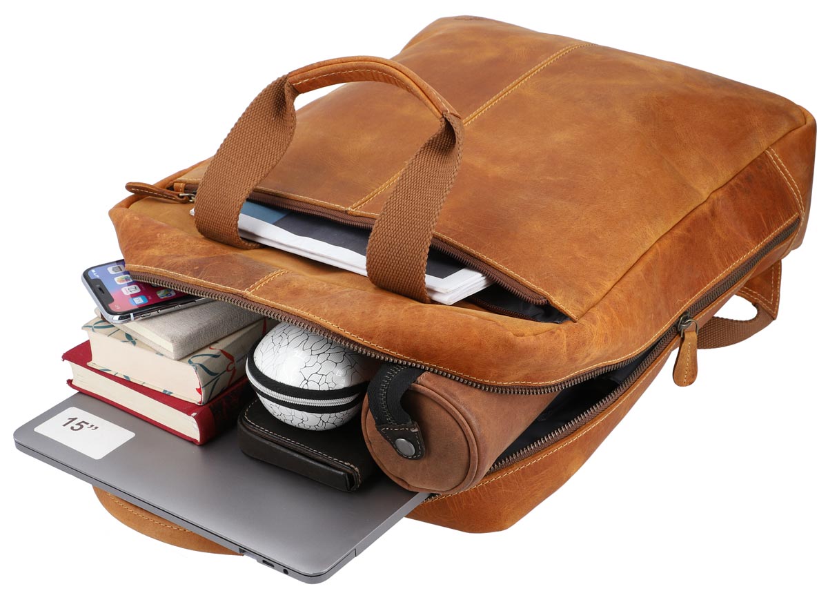 With approximately 13 liters of interior space, this medium-sized daypack in "Abbe" fits comfortably in your leather backpack, including a laptop up to 15 inches, a notebook, reading material, a water bottle, and a cell phone – thanks to the large zippered main compartment. There's also a zippered side compartment at the front. Two carrying handles and two adjustable straps complete the design. Now just throw it on your shoulder and you're ready to go – with your new "Abbe" city backpack!