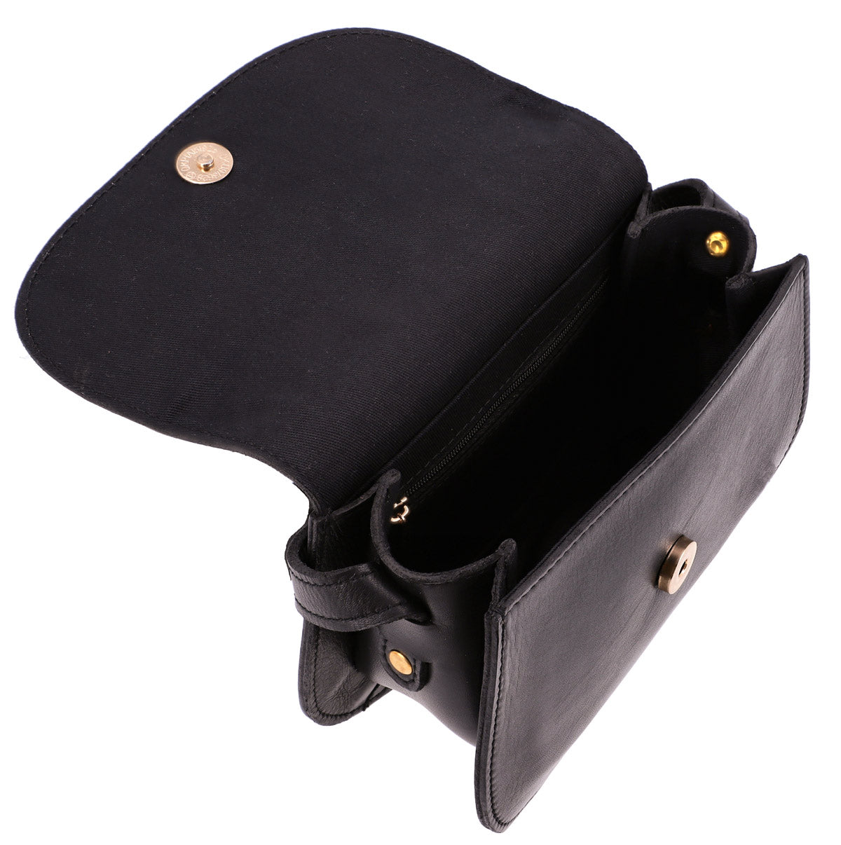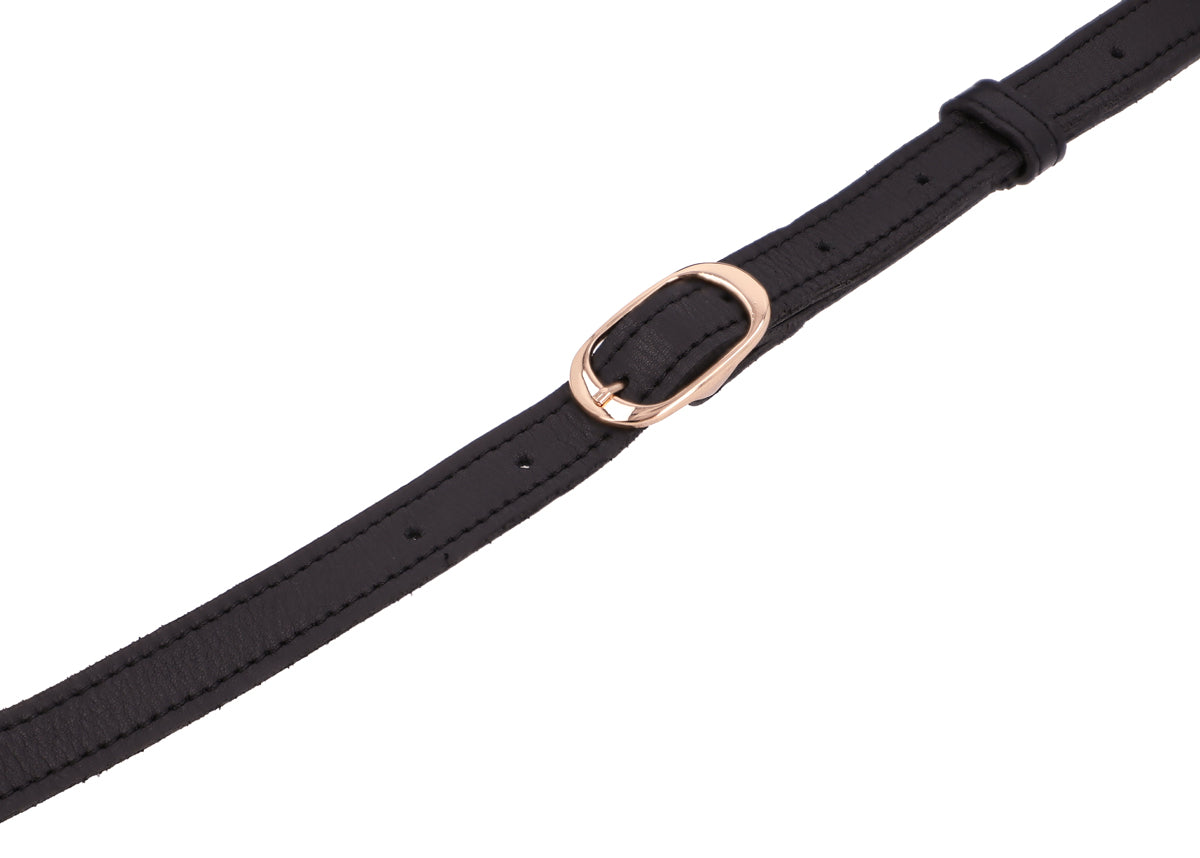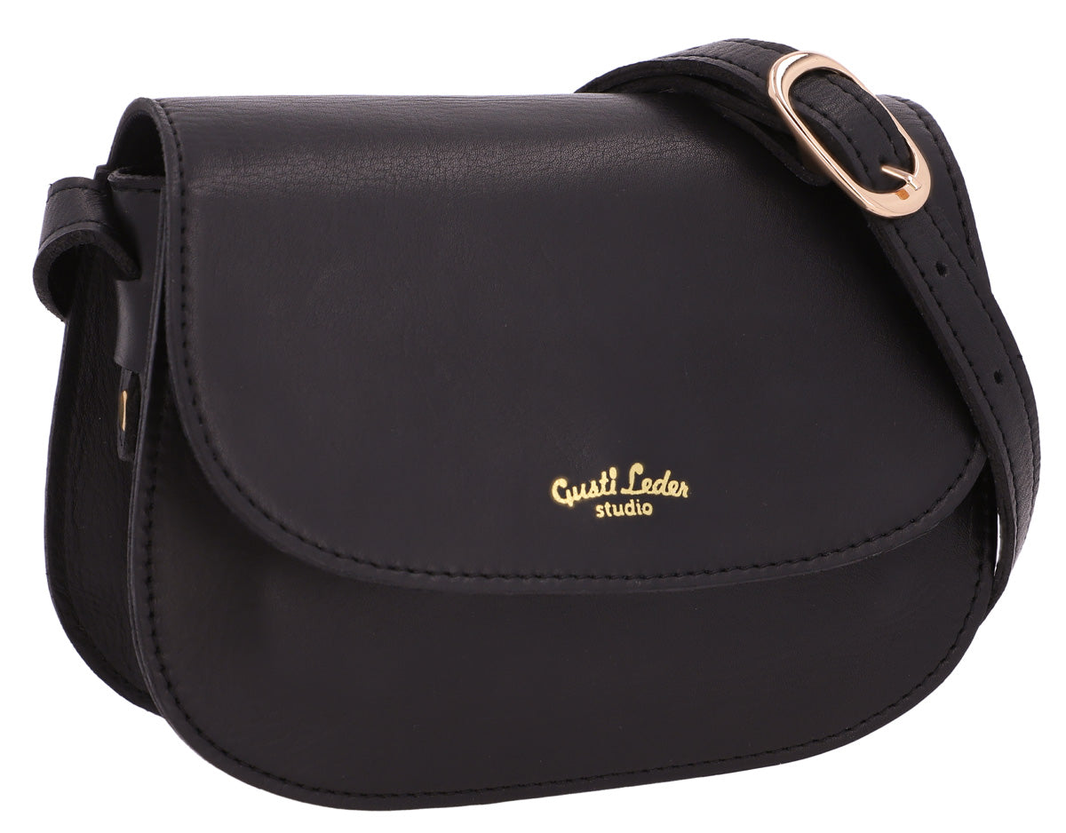 Her compact size lets you move easily through crowds but still has enough space for your essentials. So, your wallet, keys, phone and make-up are kept safe inside. The gold detailing on the black cowhide leather finishes off “Kayla's” chic design. Throw her over your shoulder and you're ready to go.