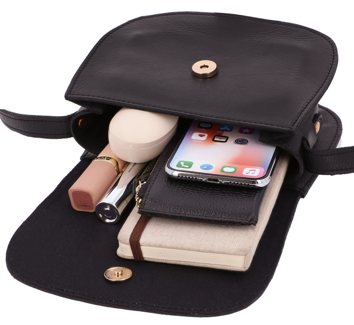 No matter if you're looking for a head-turning daytime accessory or a stylish evening bag, “Kayla's” got your back. This stylish accessory shines with her rich, black leather. She's sure to turn heads wherever you go! This compact party bag has plenty of space for all of your things and is sure to shine.