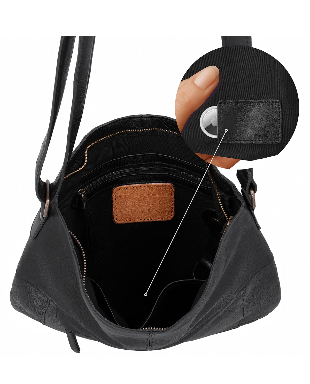 The spacious main compartment of this high-quality leather shoulder bag, which can easily accommodate documents up to A4 size, as well as the additional pockets and zippered interior compartment, give you a perfect overview of the essentials in your bag without having to rummage around for ages. To prevent your keys from disappearing in the chaos of your bag, "Maola" also has a practical key ring holder. For extra security on the go, a secret AirTag compartment is also integrated so that you can find your bag more easily at any time. And to ensure that everything you carry with you is safely stowed away and well protected, "Maola" closes with a wide , sturdy zipper. There is also another zippered compartmentintegrated into thedesign on the front, where you can store smaller items such as your smartphone or headphones so that they are always within reach. The adjustable strap ensures the necessary comfort and flexibility, so you can carry "Maola" either as a shoulder bag with a short strap or as a classic crossbody bag.