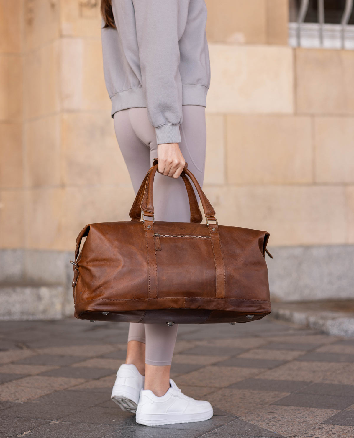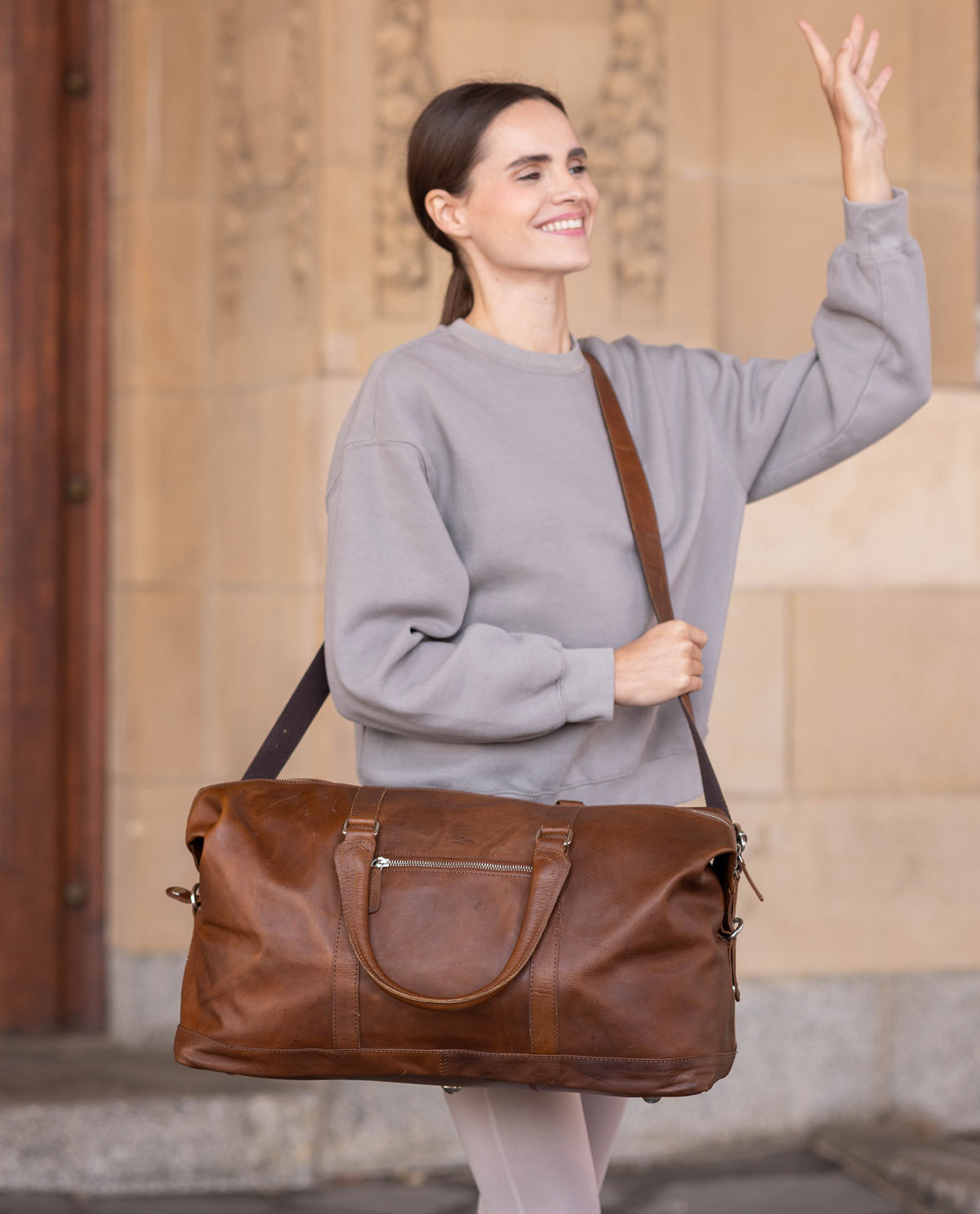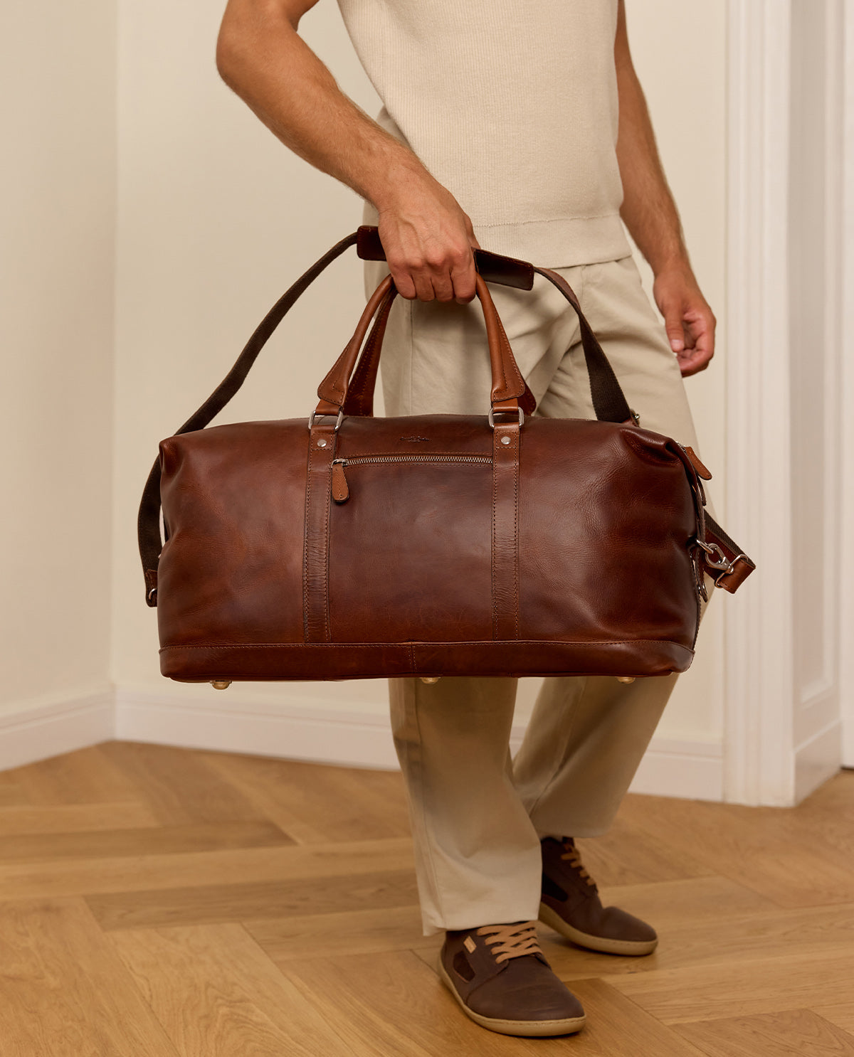 A stylish leather travel bag with a water-resistant lining and plenty of space