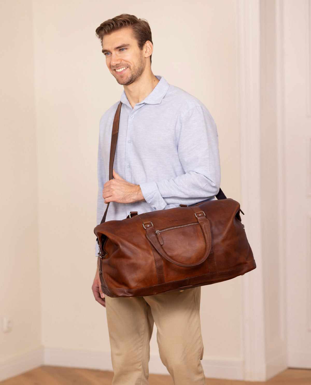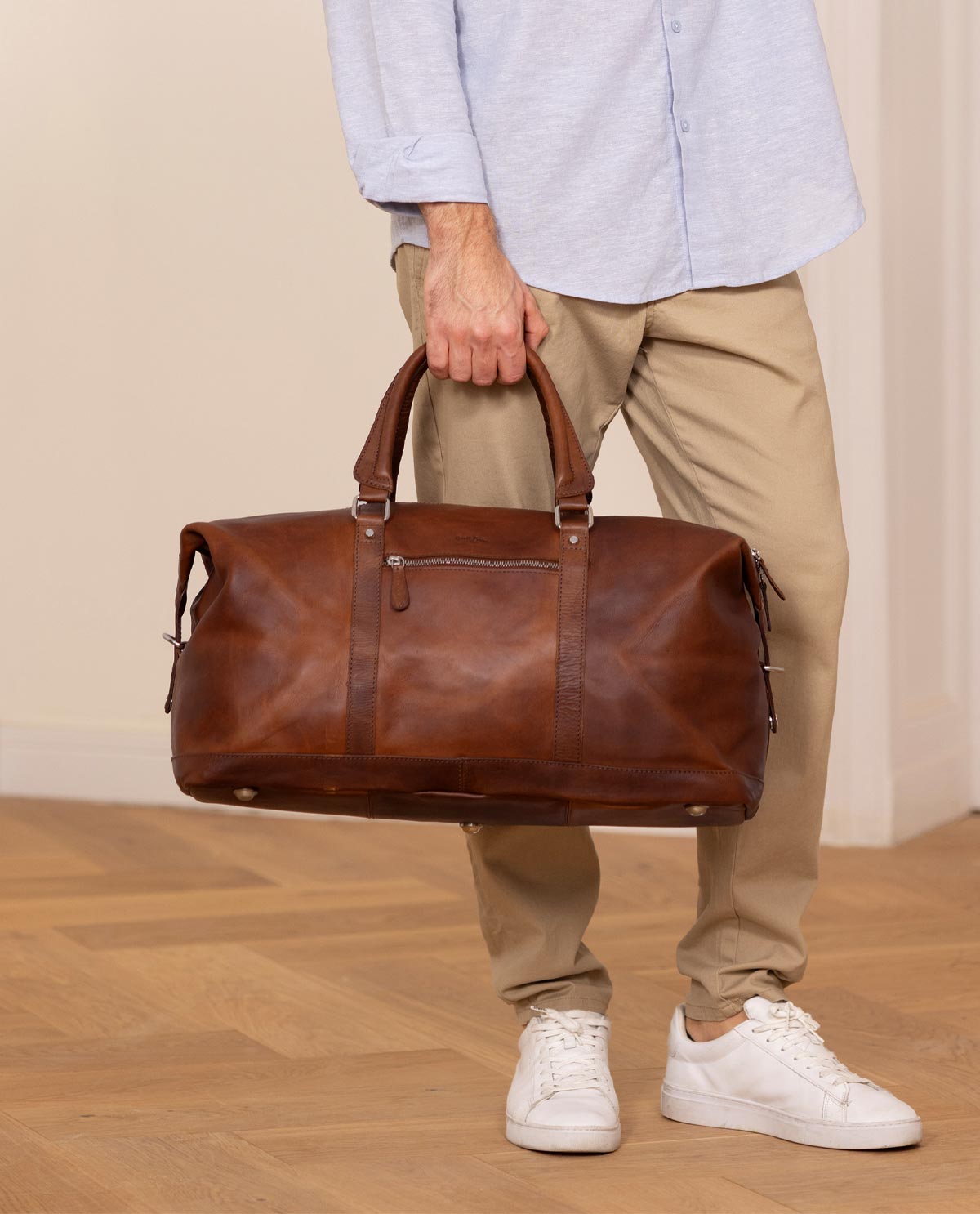Have you got a weekend trip coming up but you don’t want to take a huge suitcase with you? Then we recommend our travel bag “Ruben”. The thick leather is sturdy and has a high-quality finish which means “Ruben” can be your travel companion for years to come. The simple vintage design speaks volumes about this travel bag, which is sure to turn heads at train stations and airports around the world. This leather hand luggage is a casual, chic accessory.