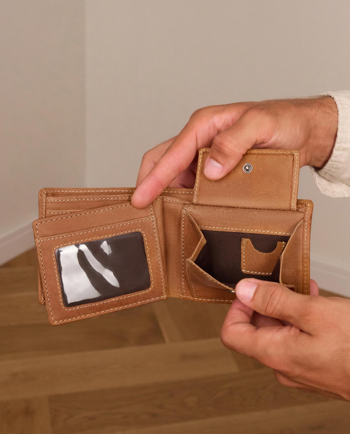 The wallet "Oswin" in noble brown combines stylish design with practical functionality. Made from high-quality leather, it offers not only an appealing appearance but also a well-thought-out interior layout. The wallet features a practical coin compartment with snap closure that securely stores your change, as well as an additional secure zippered compartment for valuables. With the embossed logo on the outside and the contrasting stitching, the wallet receives an elegant yet striking touch.