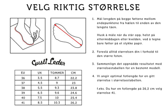 Hvis du er mellom størrelser, anbefaler vi å velge den større - spesielt for lukkede stiler som støvler, for litt mer komfort.