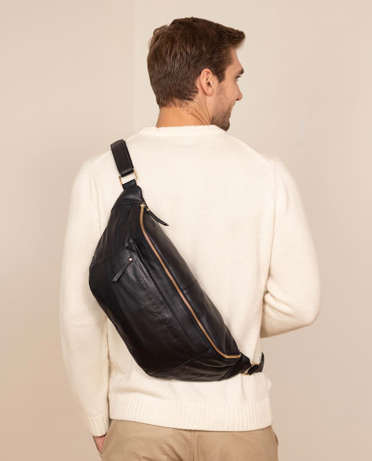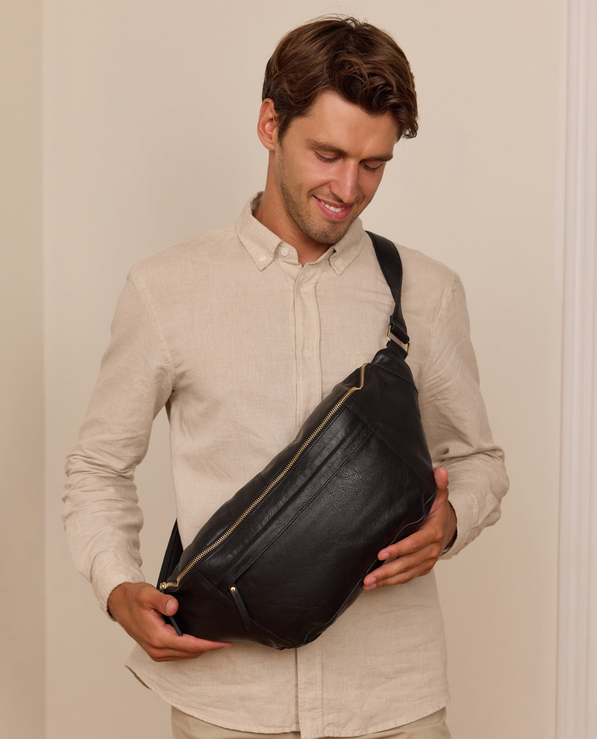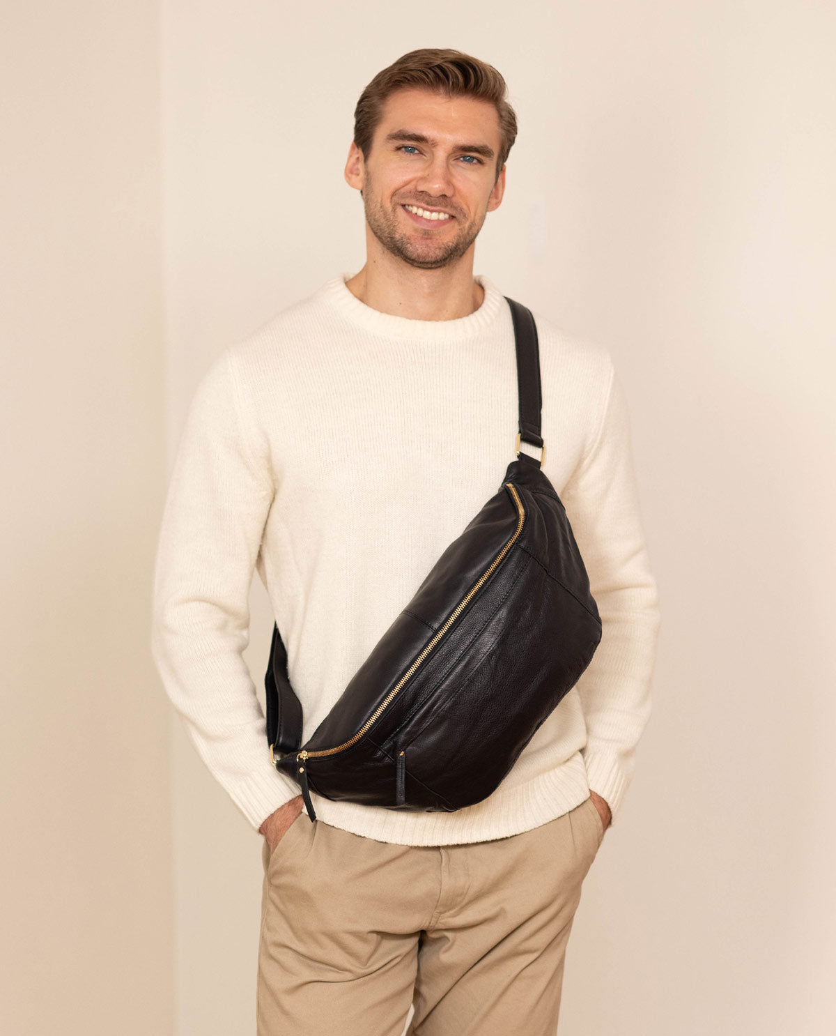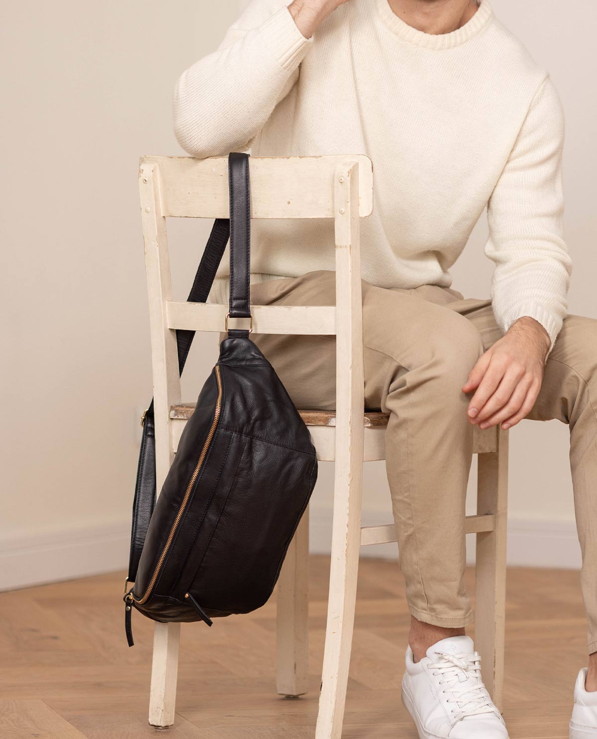 Belteveske, ryggsekk, hofteveske, festivalveske, håndveske, svart skinn