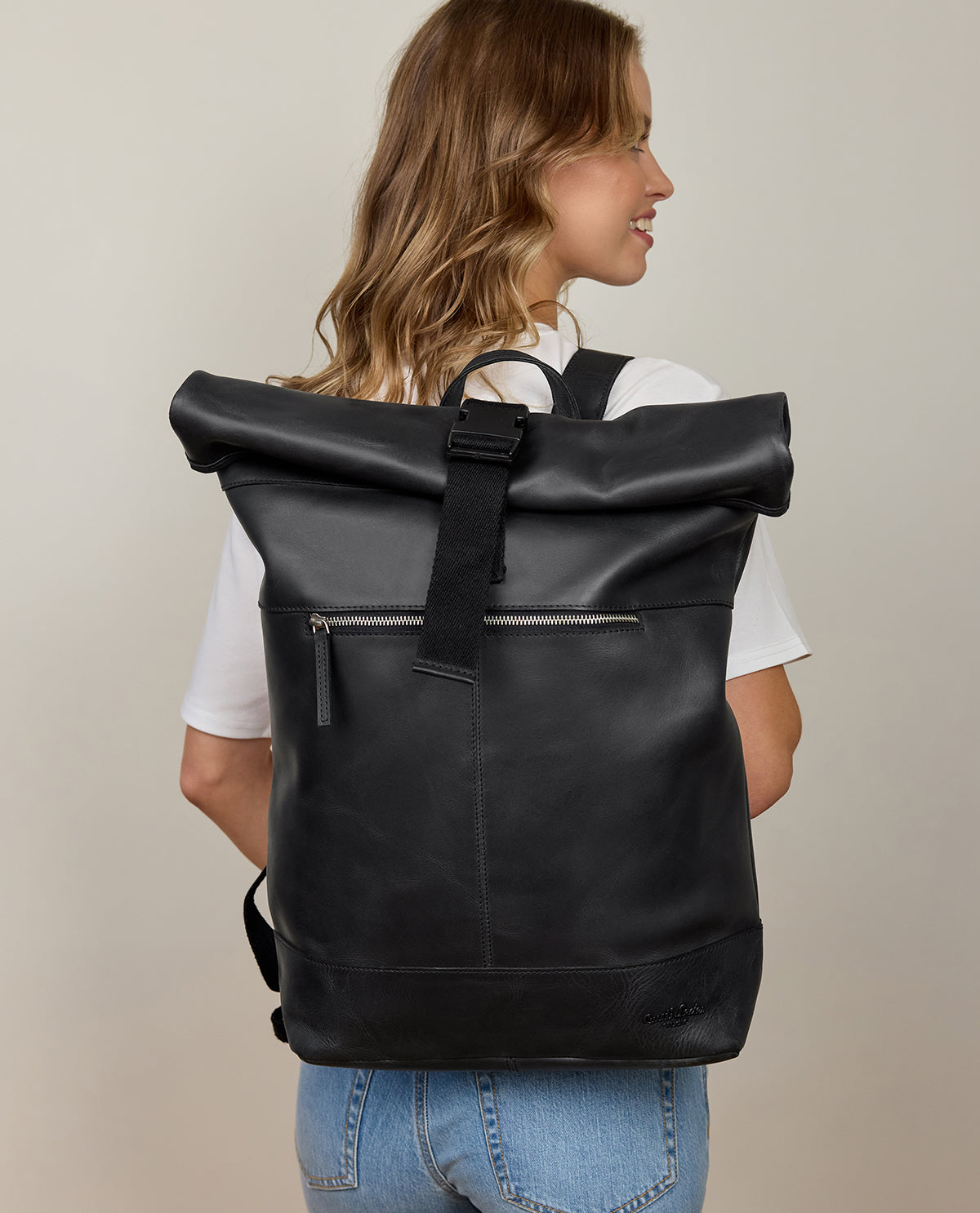 Enten det er for skole, universitet eller jobb – vår rolltop-ryggsekk "Mattis" passer alltid. For den overbeviser med sin fleksibilitet, høye bærekomfort og romslighet. Denne klassisk-robuste dagsekken i svart bøffelskinn skiller seg spesielt ut med sin trendy rolltop – en stil som for tiden er uunngåelig.