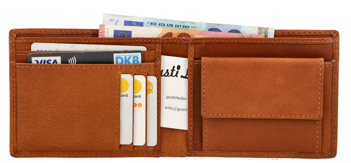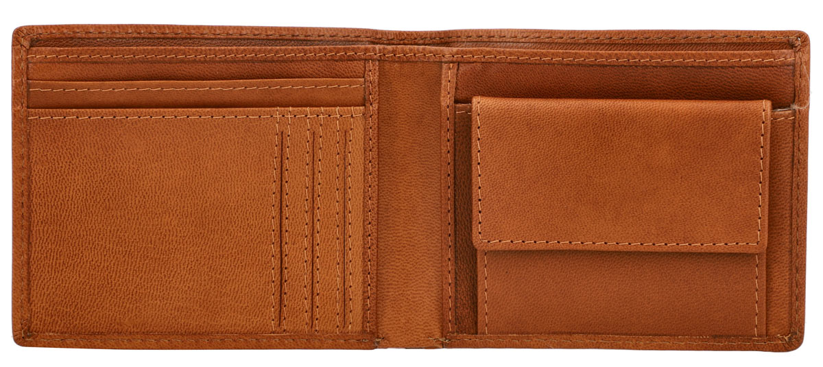 Inni imponerer "Lawrence" med sin optimalt organiserte struktur uten mye dill, som er redusert til det nødvendige uten å gå på bekostning av funksjonaliteten. Her finner du to seddellommer, en separat myntlomme som kan åpnes med en trykknapp, og bak den skjuler det seg en av de totalt tre dype stikklommene samt totalt fem kortlommer for minst like mange kort. Mer trengs ikke, og derfor avstår "Lawrence" også trygt fra ekstra flipplommer eller andre utvidelser.