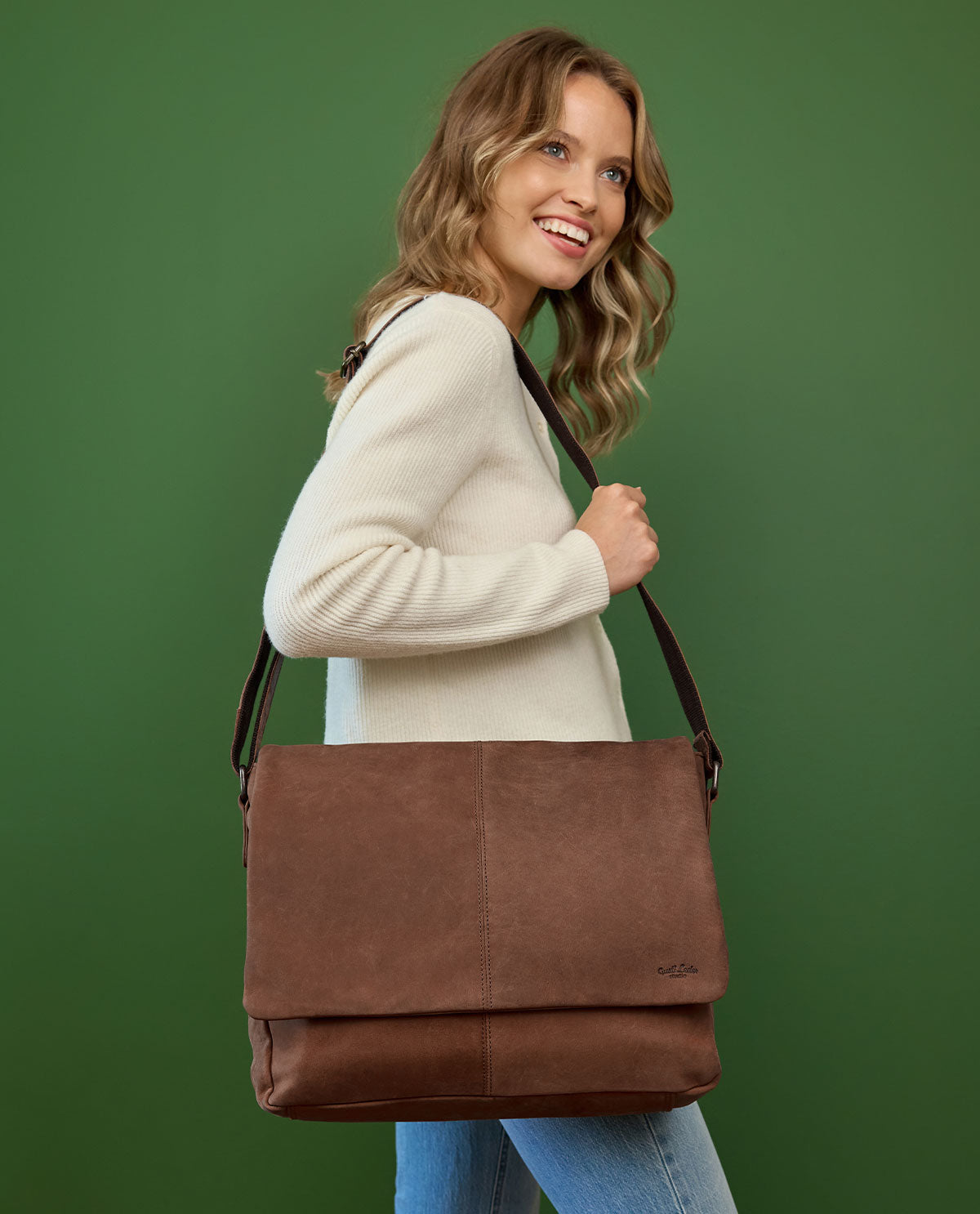 Vår skulderveske er laget av høykvalitets, robust skinn. Det slitesterke materialet får mer karakter over tid og utvikler en unik patina. Hver veske er håndlaget og har sine egne individuelle trekk, noe som gjør den til et unikt eksemplar. Den brune fargen gir vesken et autentisk vintage-utseende som passer perfekt til ethvert antrekk. I tillegg tilbyr vesken tilstrekkelig lagringsplass: Hovedrommet er stort nok for et nettbrett, en bærbar PC eller viktige dokumenter. To innvendige lommer og en glidelåslomme sørger for orden, mens den justerbare skulderstroppen gir optimal bærekomfort – enten du bærer den avslappet over skulderen eller på tvers av kroppen.