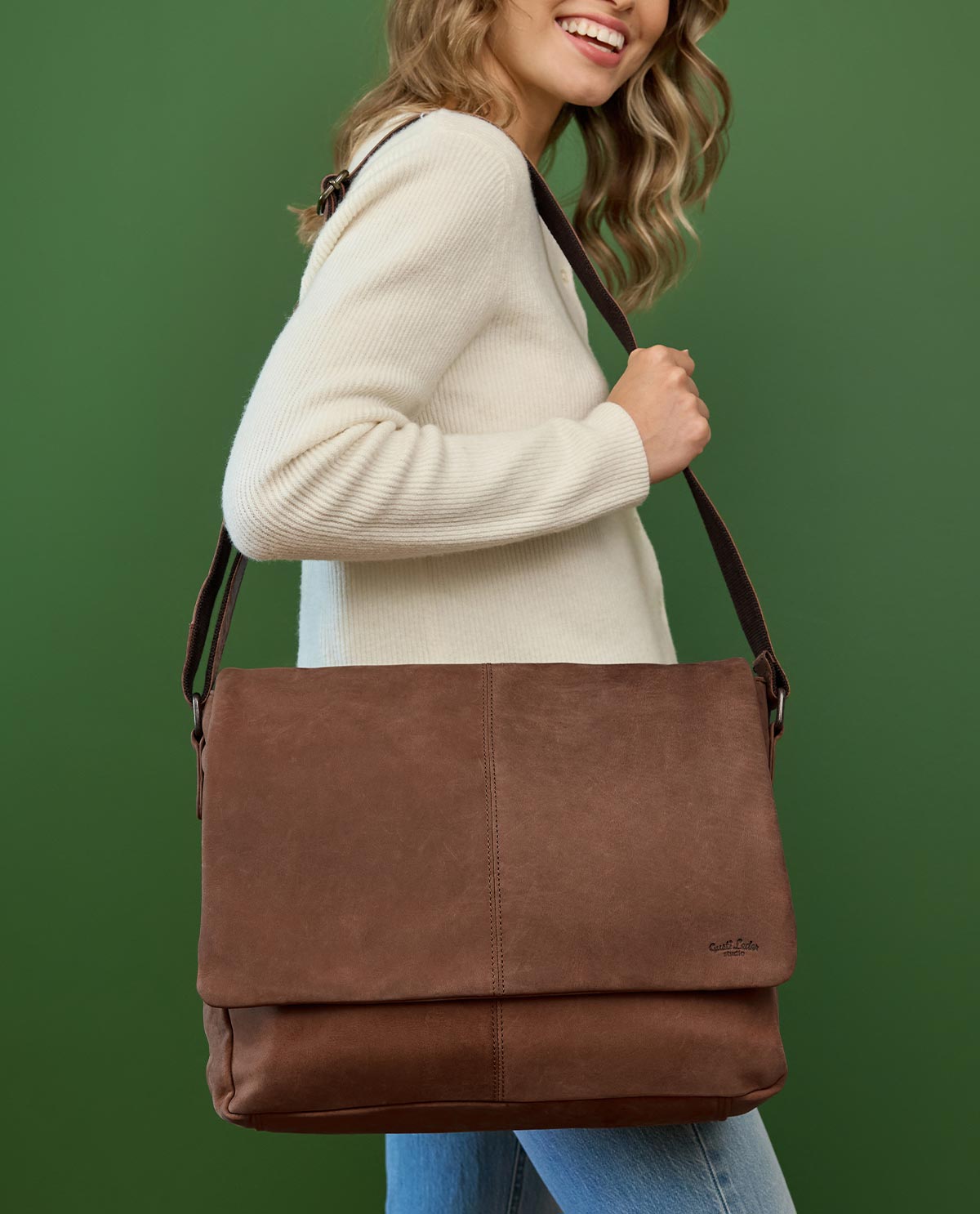 Vår skulderveske er laget av høykvalitets, robust skinn. Det slitesterke materialet får mer karakter med tiden og utvikler en unik patina. Hver veske er håndlaget og har sine egne individuelle egenskaper, noe som gjør den til et unikt eksemplar. Den brune fargen gir vesken et autentisk vintage-utseende som passer perfekt til alle antrekk. I tillegg har vesken god oppbevaringsplass: Et hovedrom er stort nok til en nettbrett, en bærbar PC eller viktige dokumenter. To innerlommer og en lomme med glidelås sørger for orden, mens den justerbare skulderstroppen gir optimal bærekomfort – enten du bærer den uformelt over skulderen eller på tvers av kroppen.
