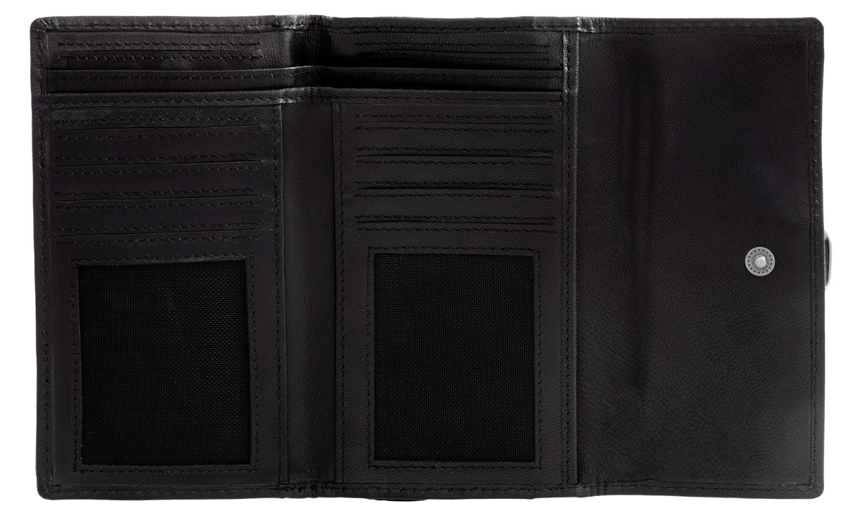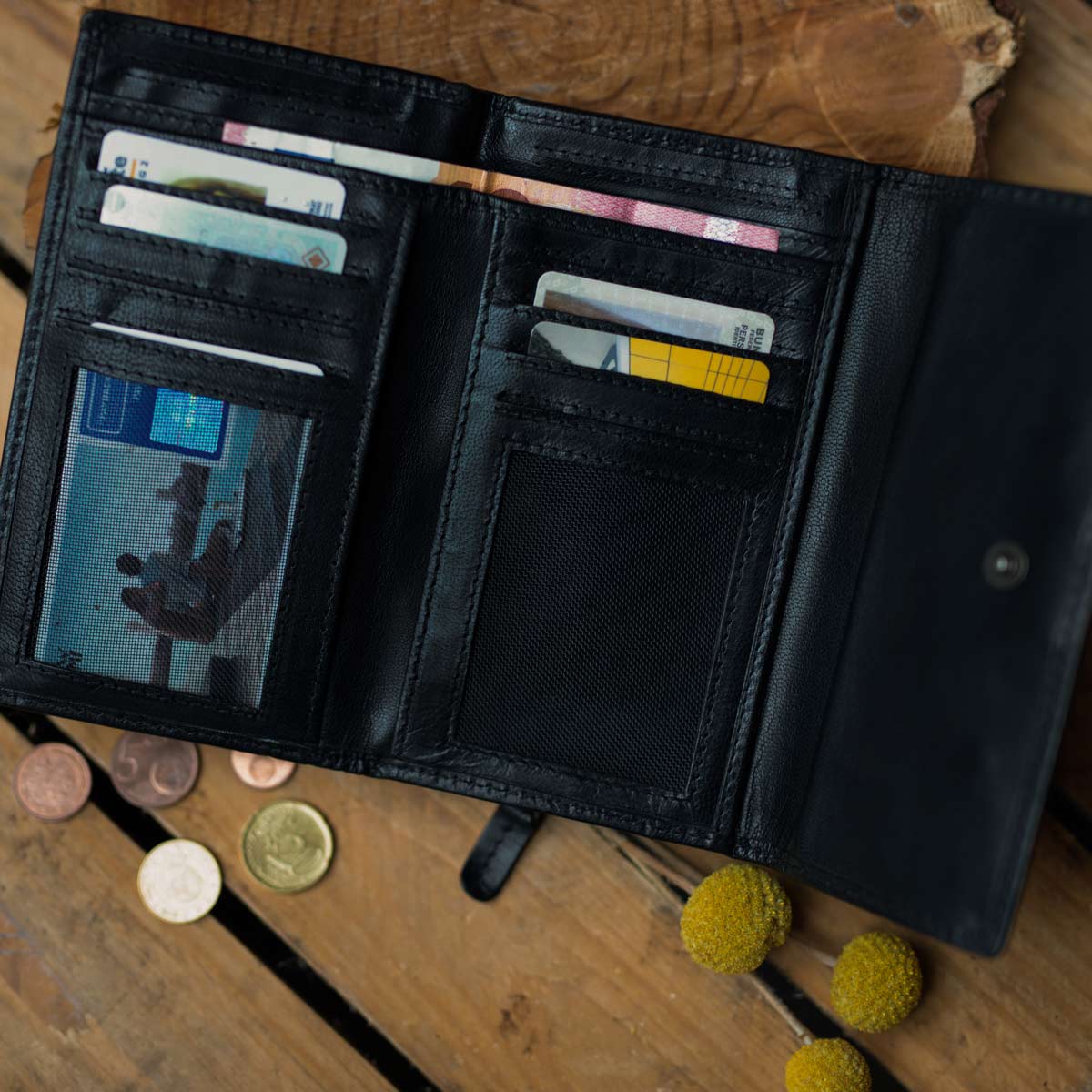 Inni imponerer "Mae" med et veldig godt strukturert ordenssystem med to seddellommer, et separat dobbelt myntlomme som kan åpnes med egen glidelås, og totalt 8 kortlommer for (minst) like mange kort. To sidemonterte innstikklommer utvider lommebokens lagringsplass ytterligere, samt de to vinduene der du enkelt kan oppbevare ID-kort, førerkort eller bilder av dine kjære.
