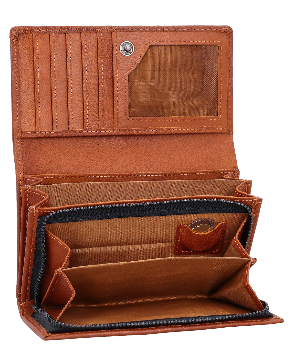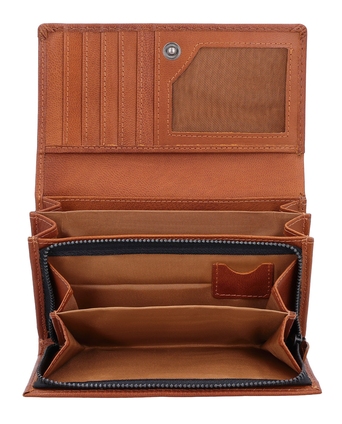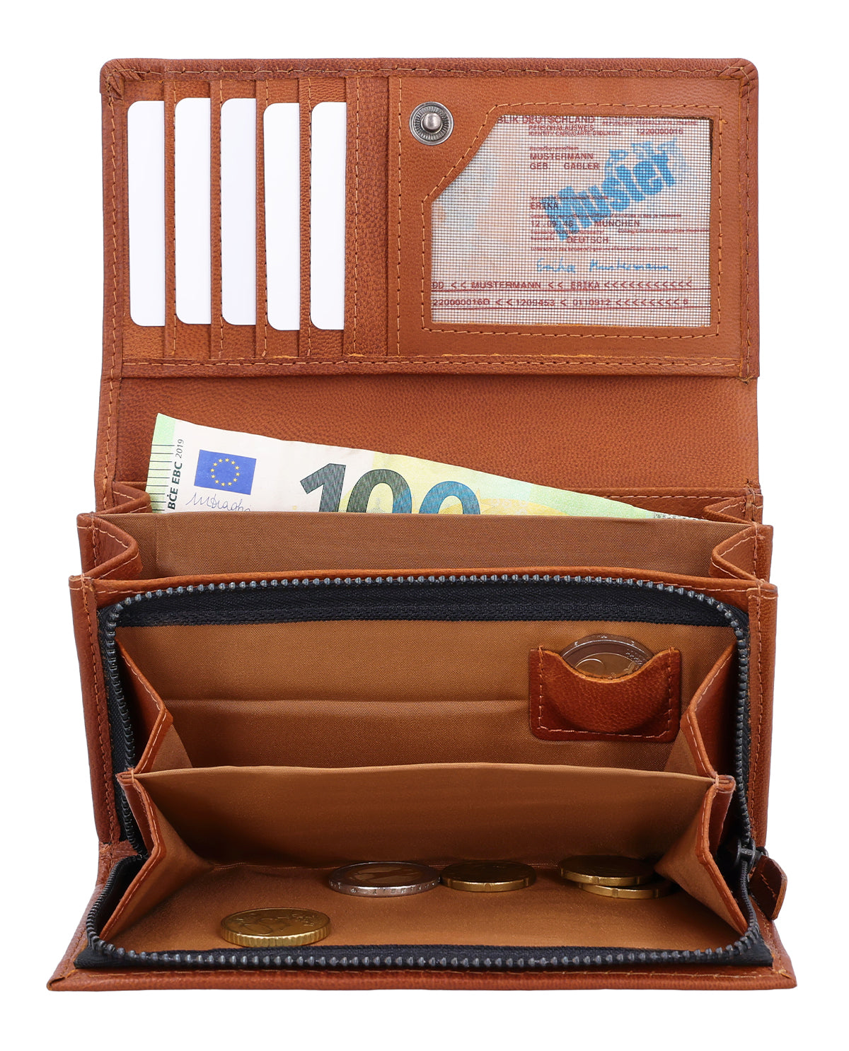 Med vår lommebok «Gemma» har du alt med deg: Kort, sedler, småpenger og billetter har sin faste plass. De to småpengerommene kan lukkes med glidelås . I tillegg er det et ekstra myntrom for en enkelt mynt – ideelt når du raskt trenger en passende mynt. I «Gemma» er det plass til minst fem kort, og vi tilbyr også et kortrom med gjennomsiktig vindu for eksempelvis ID-kortet ditt. Sedlene dine er godt oppbevart i to separate rom. Takket være integrert RFID-beskyttelse er kortene dine også pålitelig beskyttet mot uønsket avlesning. Resten av lommeboken holdes sammen av en trykknapp. Slik får du raskt tak i pengene dine, men de er likevel beskyttet mot å falle ut. Lommeboken er la get av robust okseskinn og er en ekte hverdagshjelper: perfekt for de som handler mye og de som ønsker å bli det!