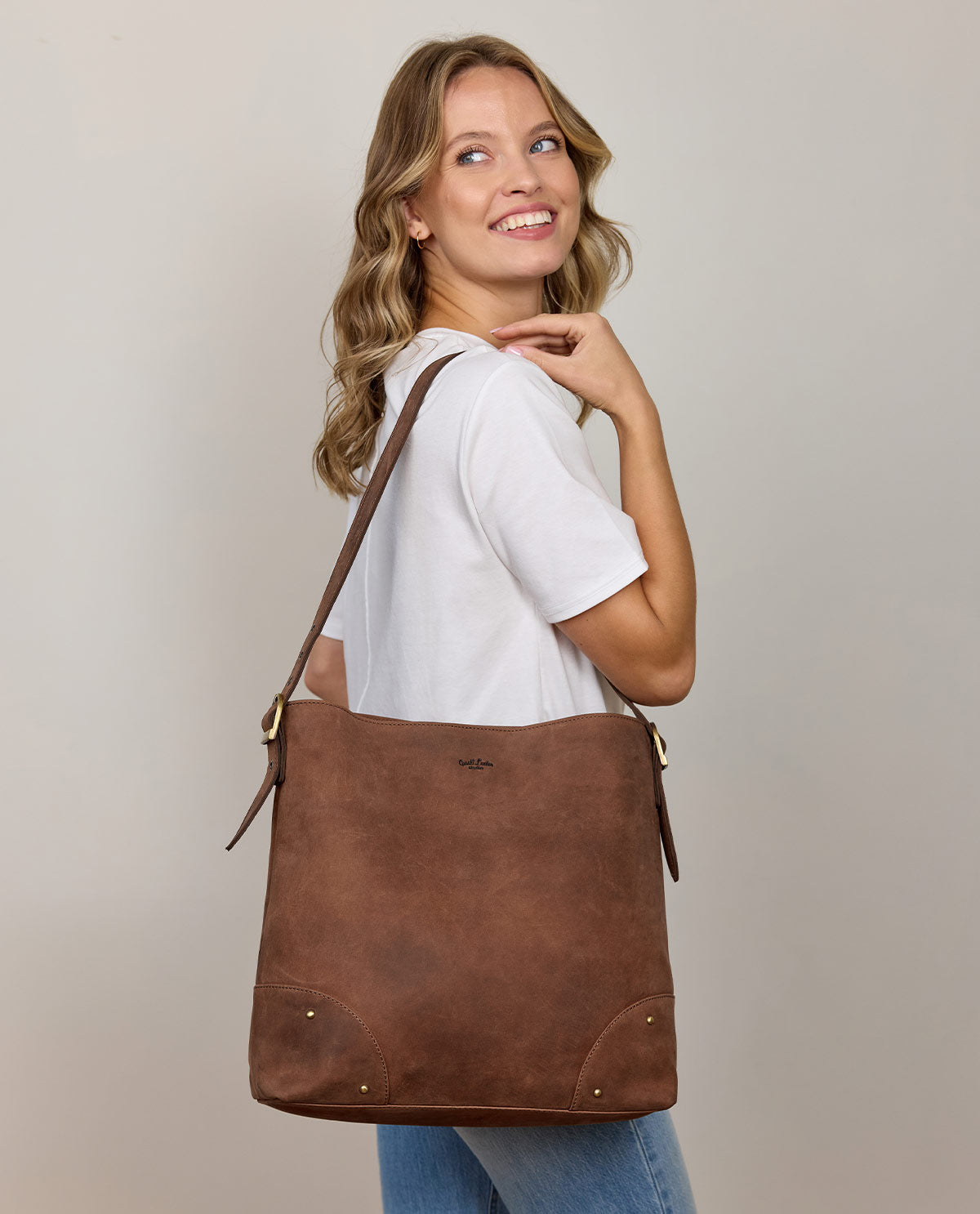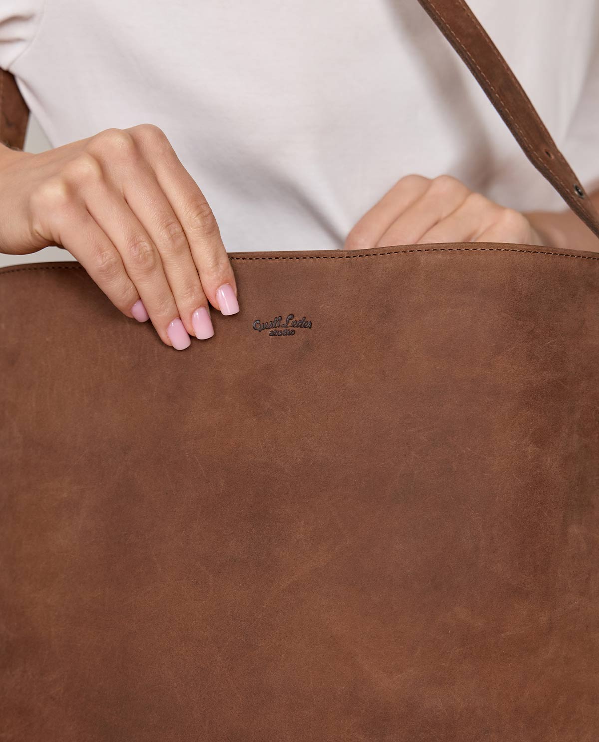 Håndvesken "Moje" i edel brun kombinerer stilfullt design med gjennomtenkt funksjonalitet og er den perfekte følgesvenn for enhver kvinne. Den justerbare skulderstroppen med messingspenne lar deg bære vesken akkurat slik du ønsker – komfortabelt over skulderen eller på tvers av kroppen. Med den praktiske magnetiske lukkingen blir innholdet trygt oppbevart, mens den gjennomtenkte innvendige inndelingen sørger for perfekt organisering. Det bærbare rommet tilbyr tilstrekkelig plass for din laptop og beskytter den pålitelig. To andre åpne rom er ideelle for mobilen din, laderen eller andre viktige småting.