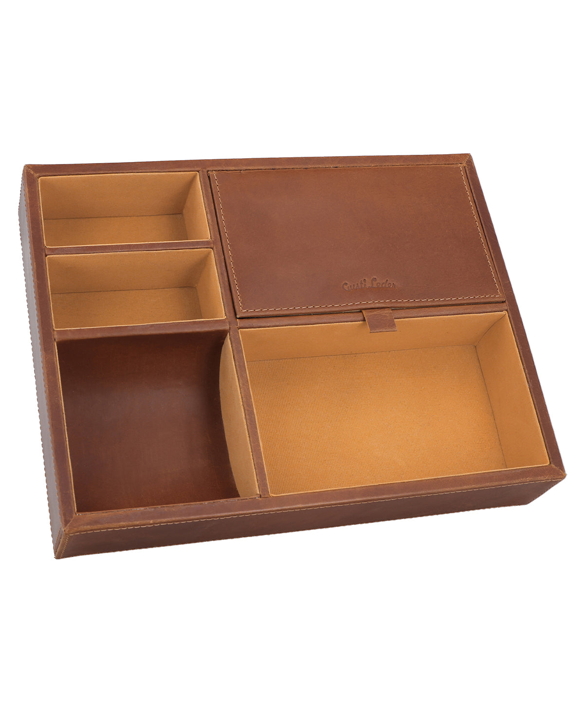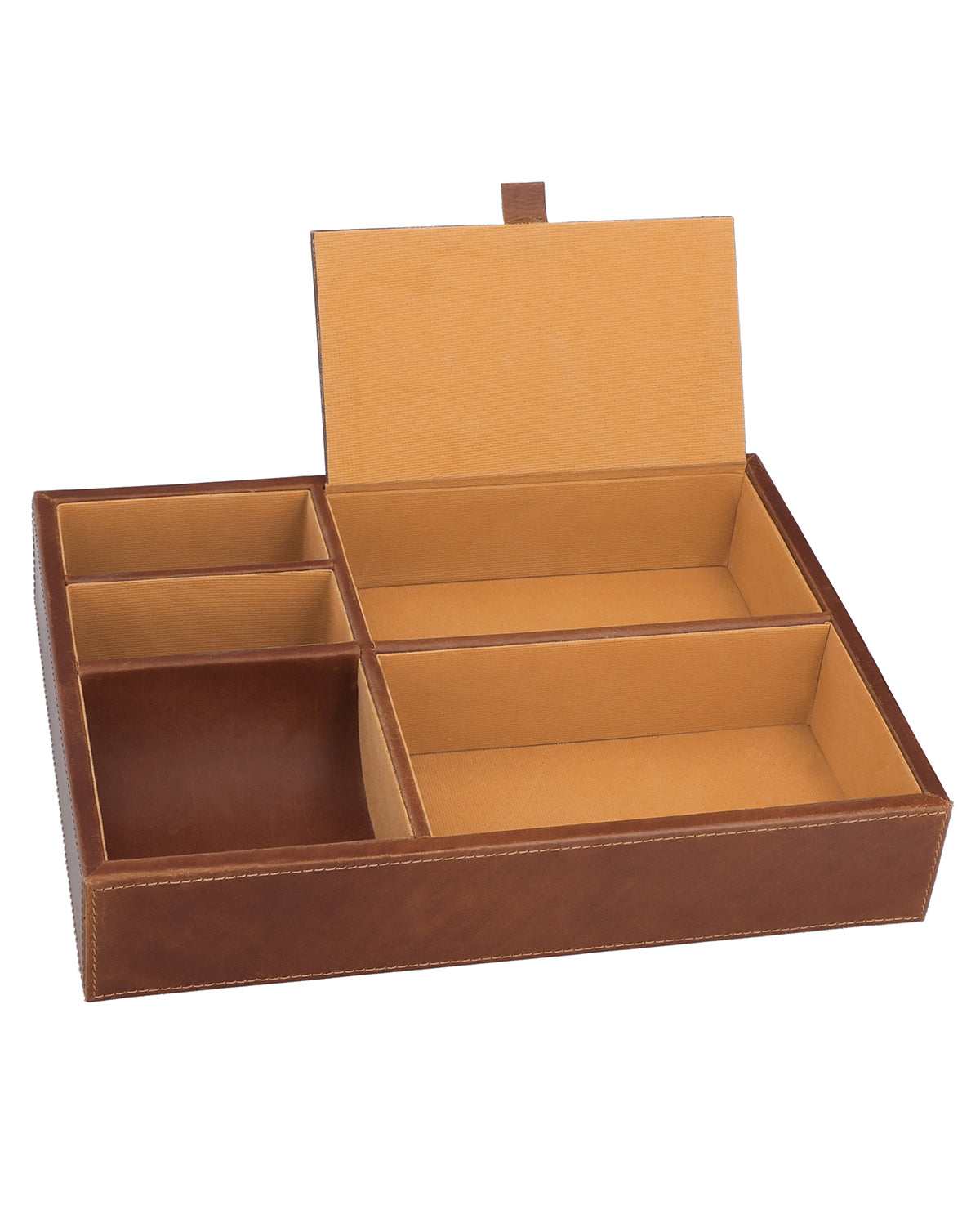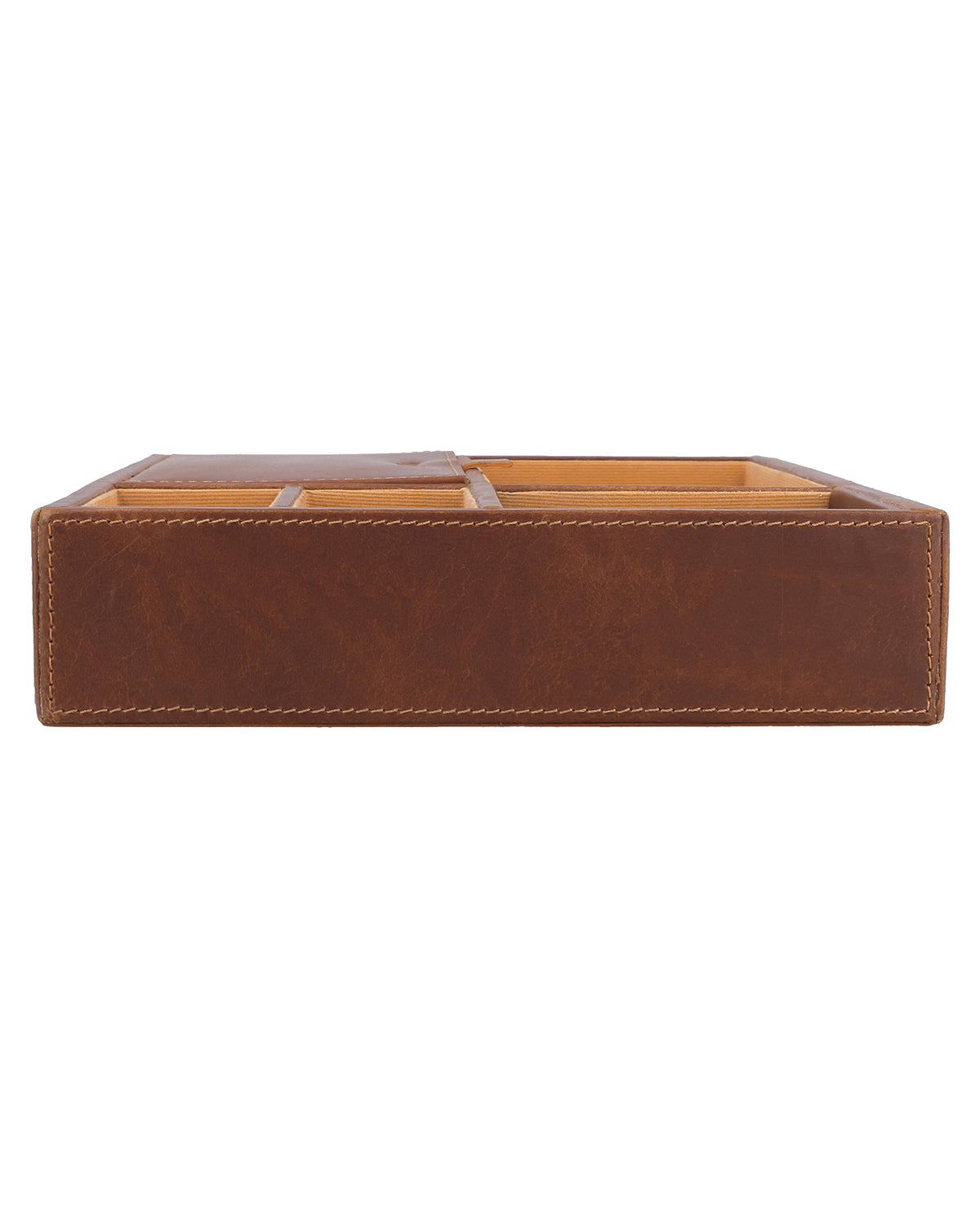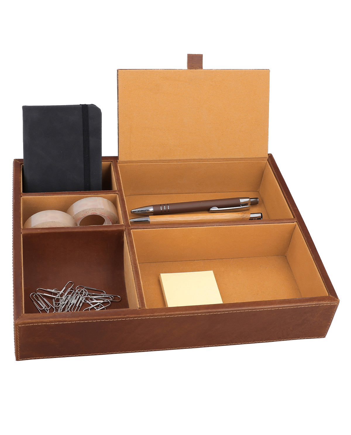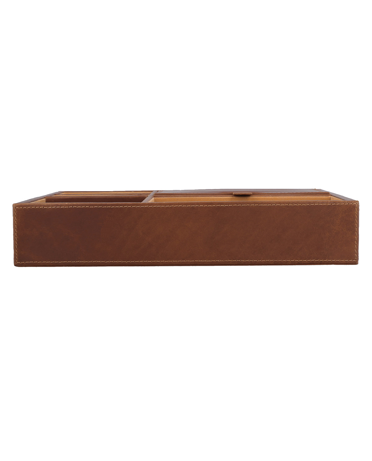 Med "Bianka" bringer du eleganse og struktur til skrivebordet ditt. Laget av høykvalitets skinn med en glatt overflate, kombinerer denne organisatoren funksjonalitet og tidløst design. De forskjellige åpne rommene i ulike størrelser gir deg muligheten til å sortere penner, notatlapper, briller eller andre personlige eiendeler på en oversiktlig måte. Slik forblir arbeidsplassen din ryddig, mens det edle skinnet gir kontoret ditt en varm, luksuriøs touch – perfekt for alle som ønsker å kombinere organisasjon med stil.