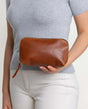 Toalettmappe kosmetikkveske med vanntett innefôr brun lær